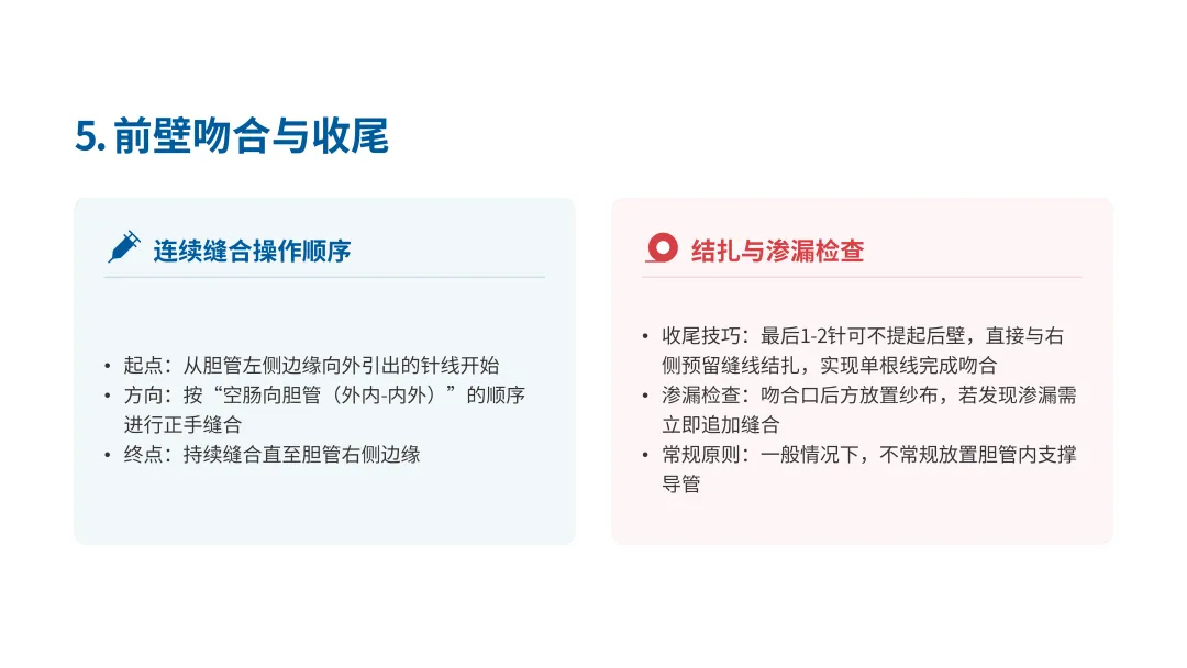 C. 缝合前壁时,最后将线向胆管外引出,和后壁的线进行结扎,吻合结束