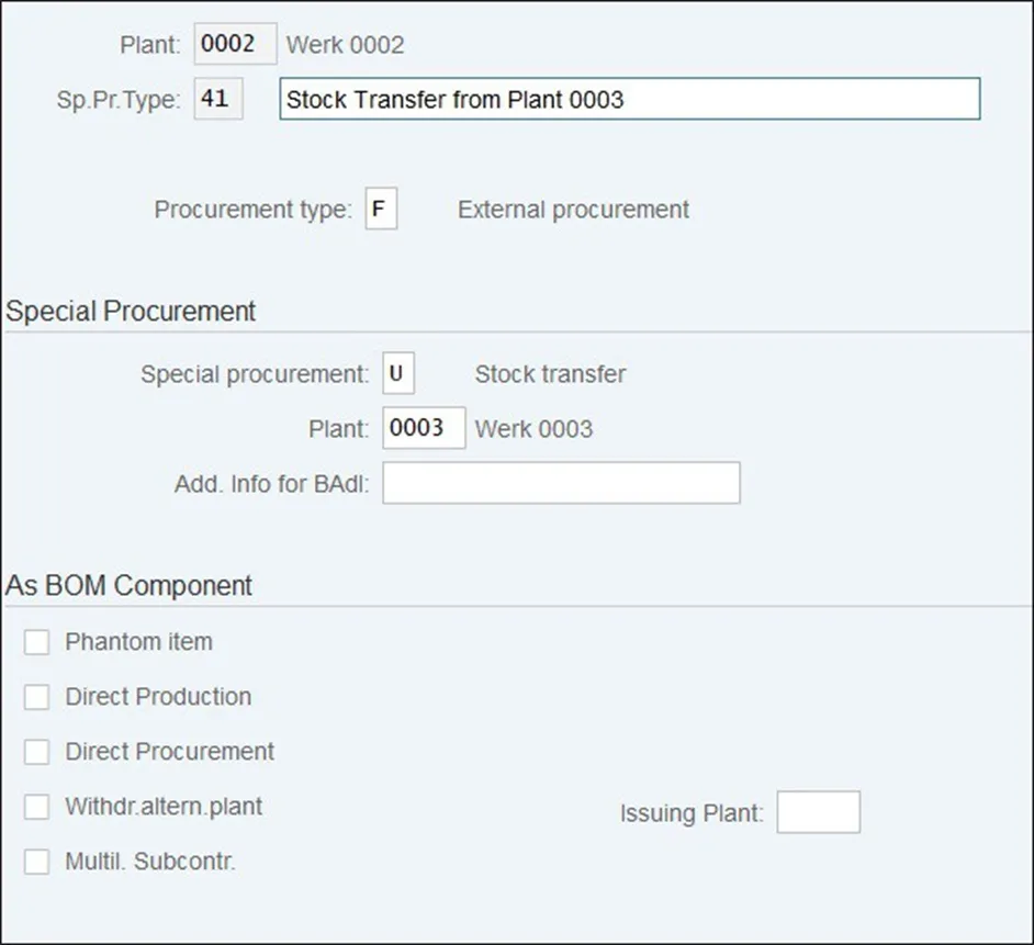 当应在不同的工厂中计划和消耗组件时,将使用此特殊采购类型。将为替代工厂创建此特定组件的相关需求,并从中采购该组件。
