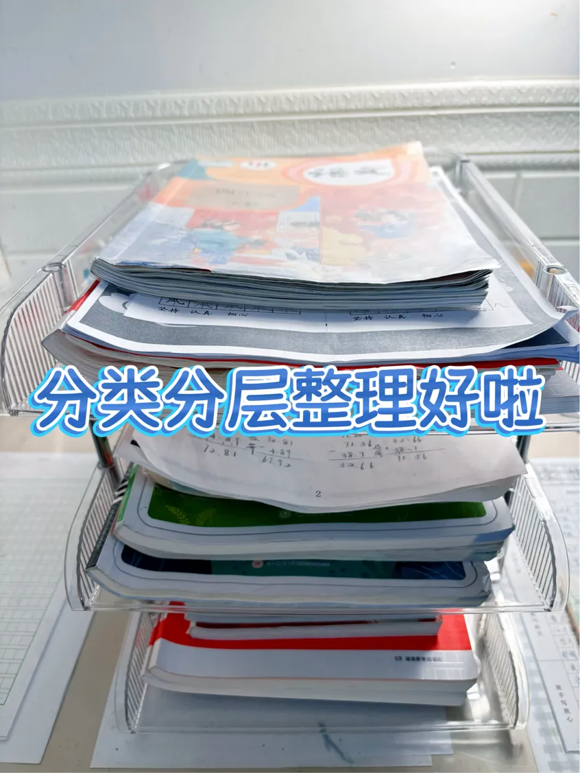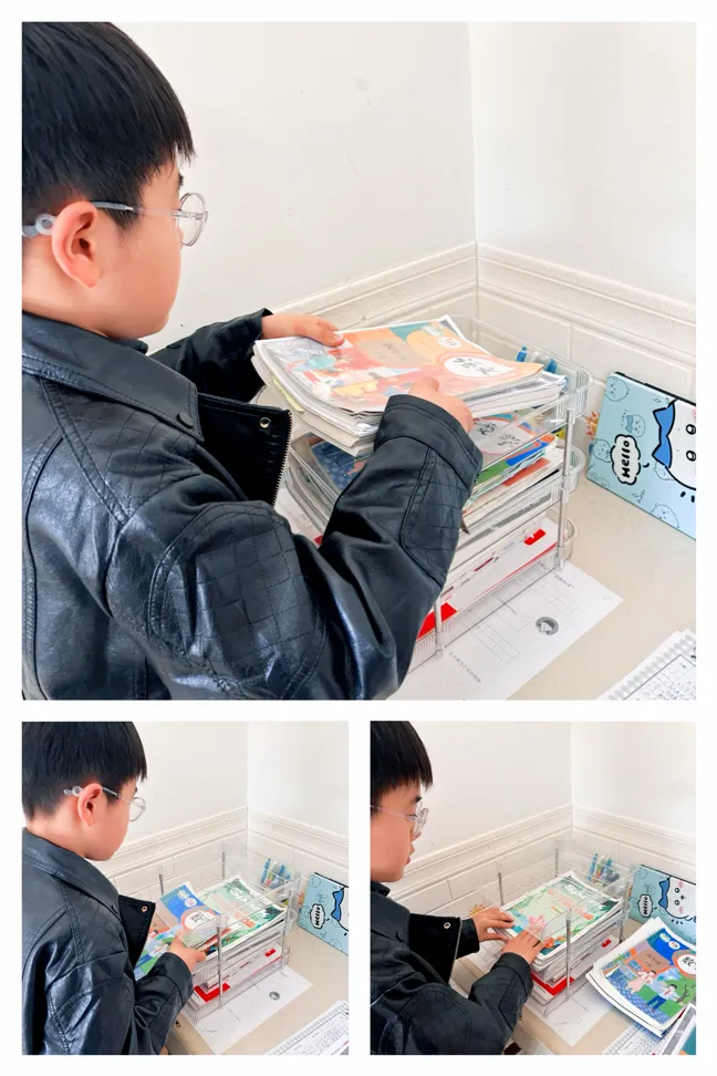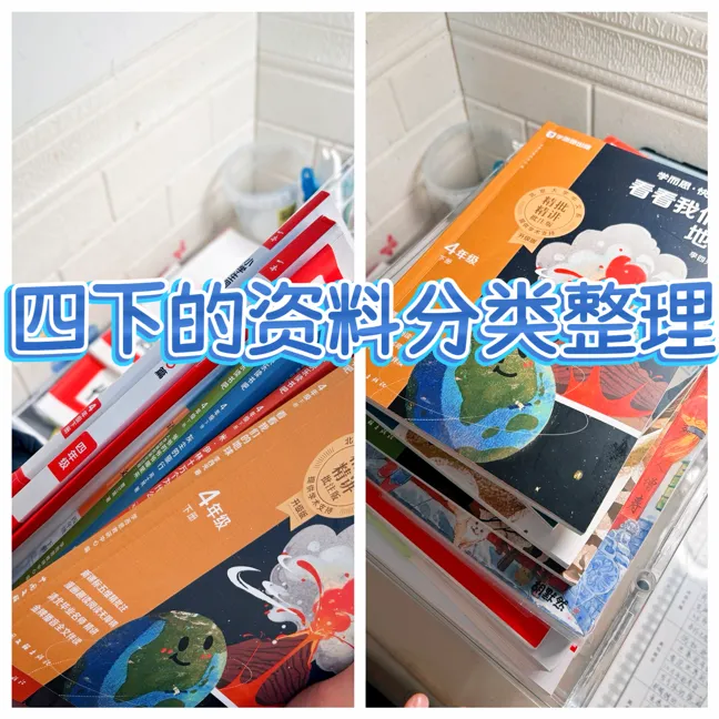 接着,把我的四年级下册学习资料,再按照语文、数学、英语分层放到文件架上,摆放在方便拿的地方。