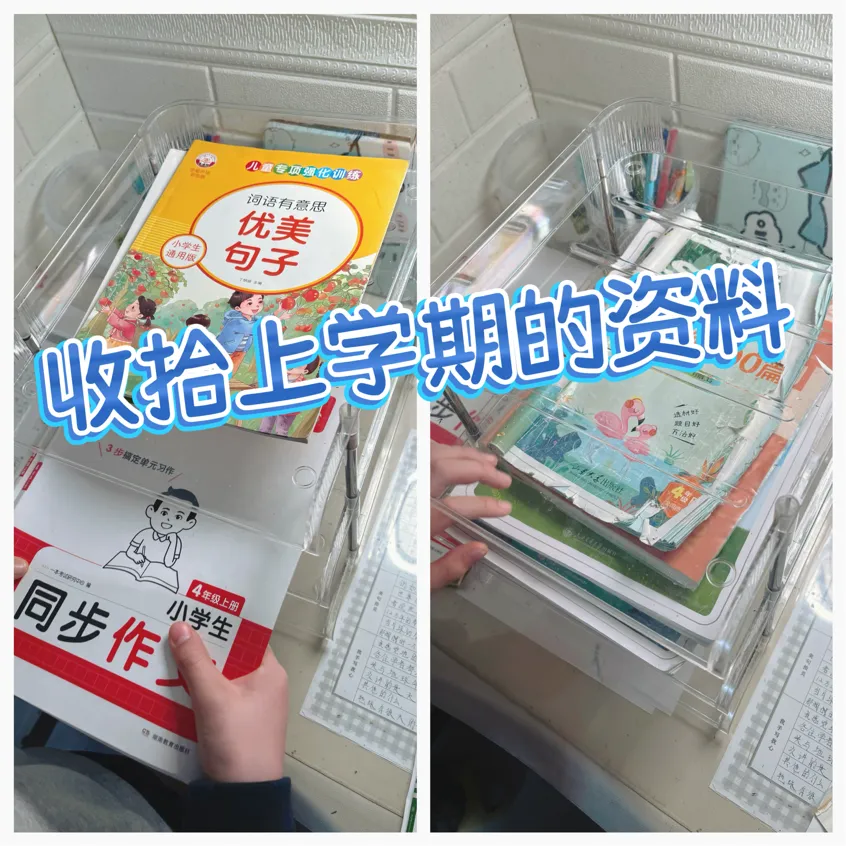 我先把四年级上册的课本、学习资料从常用的文件架上拿下来,用文件袋装好,放进柜子里。看着这些旧资料,我知道,这是我上学期努力的见证。