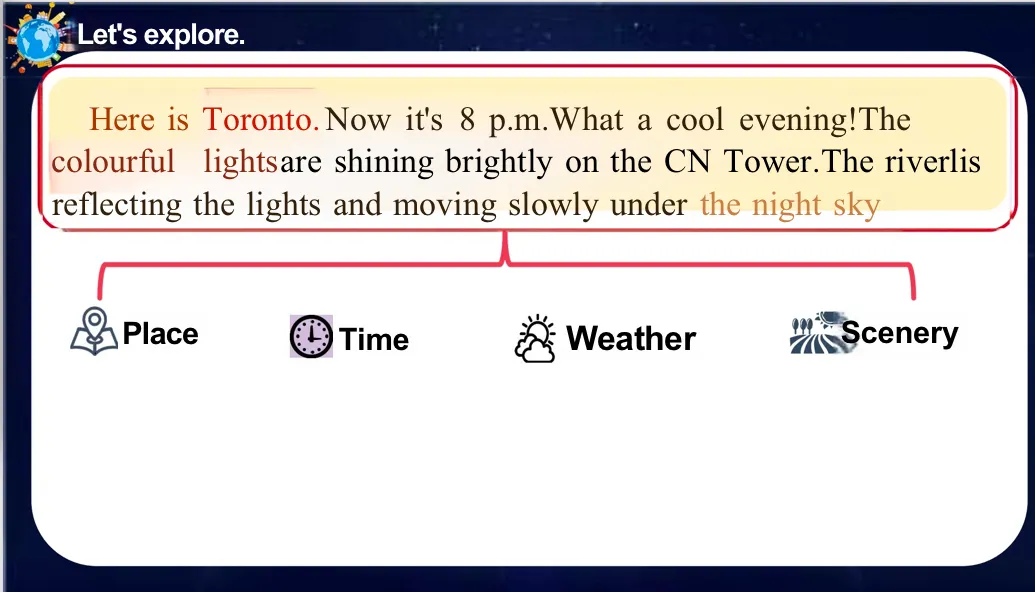 Perfect. Look!Part 1 talks about the…?Toronto is the…?Place. Well, excellent! And…?Time. Excellent! And…?Weather.And…?Yeah, the beautiful scenery. Perfect! So we can say part one sets the…? Scene. Yes.