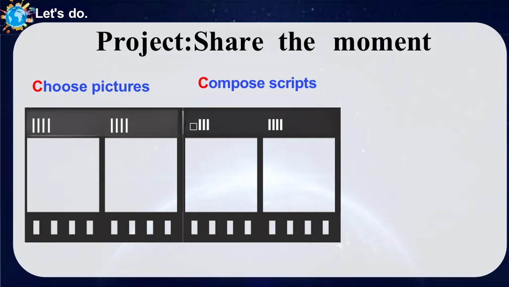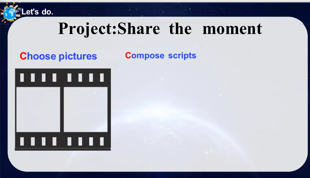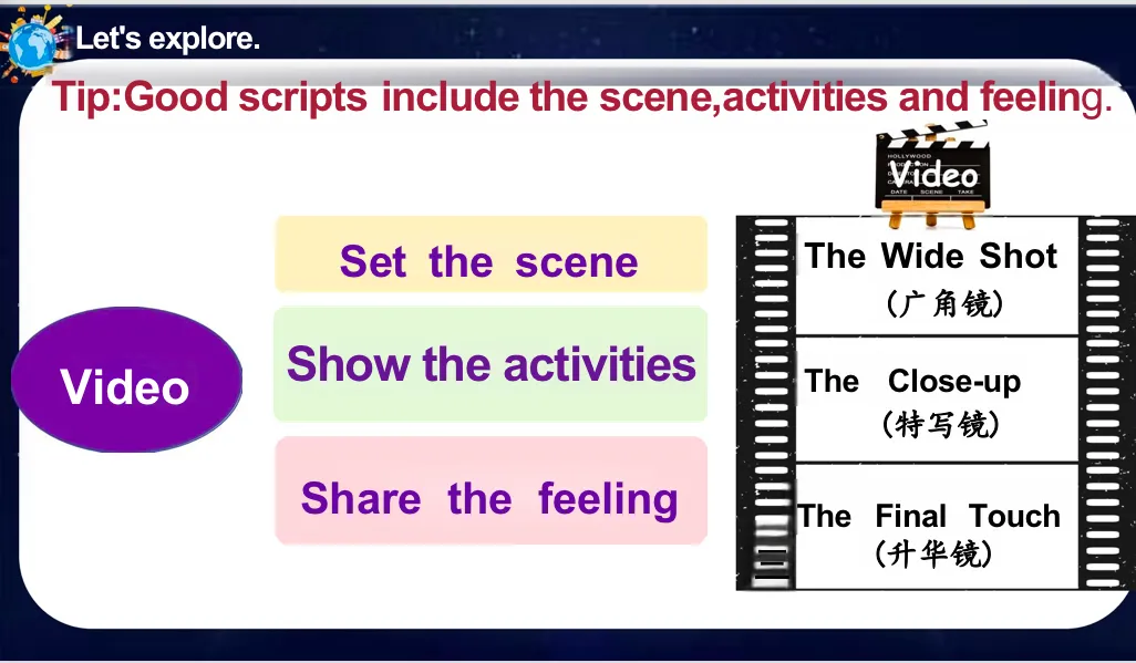 So just now we read the script of a joyful night in Toronto. And it has three parts. That is….?Yes, that's set the scene, show the activities and share the feeling. And that’s the secret of good scripts.(学生通过观察分析比较一系列图片范例,并参与下足讨论,合作探究视觉信息与情感表达的关联,他们逐步归纳建构出能够有效传递“美好与快乐”情感的图片特质,提升审美感知能力与批判性思维,为后续创作奠定了坚实的审美基础)