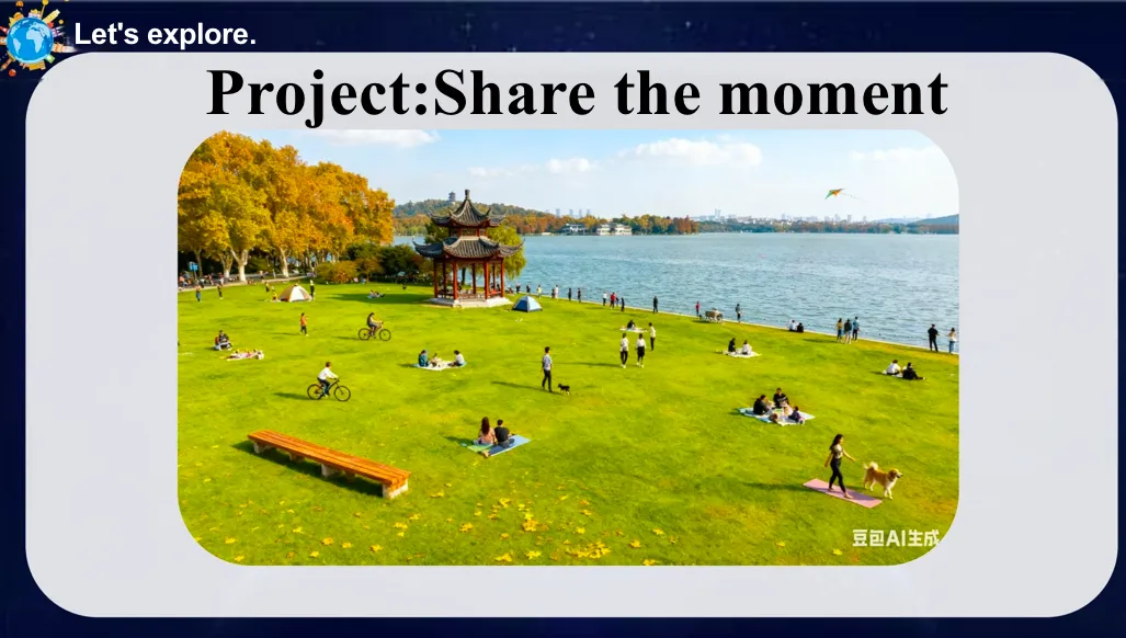 So first look in the part one,do they describe a clear scene?Yeah, there are many people. And look, they show different….?Oh, yes, activities. Right. And how about part three?Yeah, they share the feeling, right? Yeah, from which words? Wonderful. Oh, beautiful. Yes, enjoy. Yes. I like this word. Oh, yes, free and happy. And what else? Maybe the…? Wow, got it. Very good. Oh, but unluckily, they didn't describe the scene. Yeah, let's help them. How to describe the acene? Remember? Look at this beautiful scene. Yeah, you can see here. A grass. Yes. And…? Lake. Yes. And…? Sky. Yes, from this part. Clear. Yeah, OK, I give you two more minutes to polish your writing. OK? Yeah.