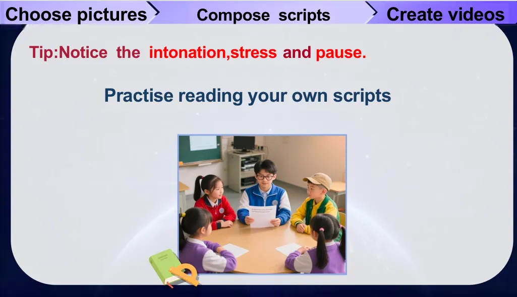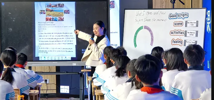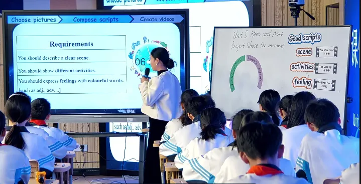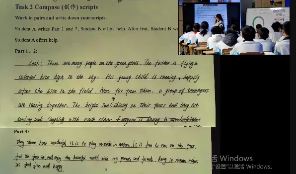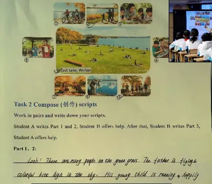 So have you finished it now? Yeah, so look, check if you got the scene? Yes or no? The activities and feeling. Yes, thank you. Very excellent.(在脚本创作阶段,学生能够结合“优秀脚本”评价标准,并在此基础上进行个性化的创造性表达。该过程不仅培养了学生依据标准进行自我修正的原认知策略,也促进了其将审美判断转化为有效语言输出的综合实践能力)