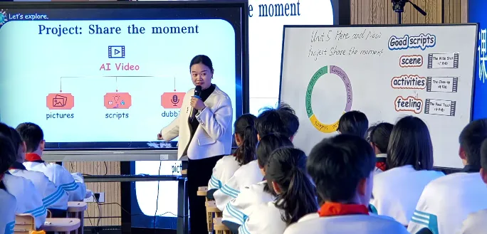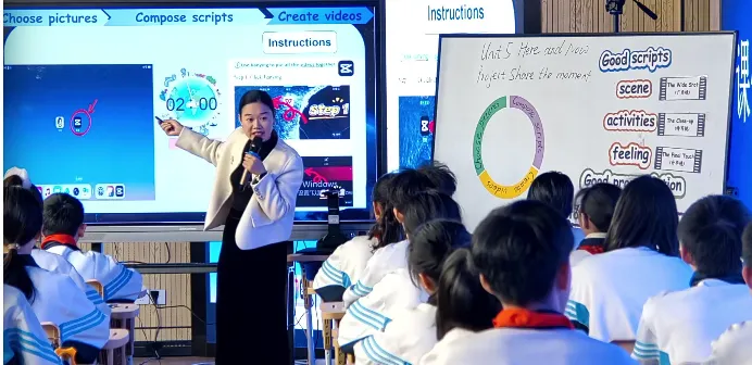 But unluckily, your video has no sound, right? Yeah, so you have to read out your scripts and dubbing the video. Clear? Yeah.(在视频合成阶段,学生能够自主阅读并遵循技术说明书进行操作,通过规划尝试与调试,将静态的图片与文本创意转化为动态的数字叙事作品。这一过程有效培养了学生的数字化学习与创新素养,以及运用技术工具解决实际问题的实践能力)