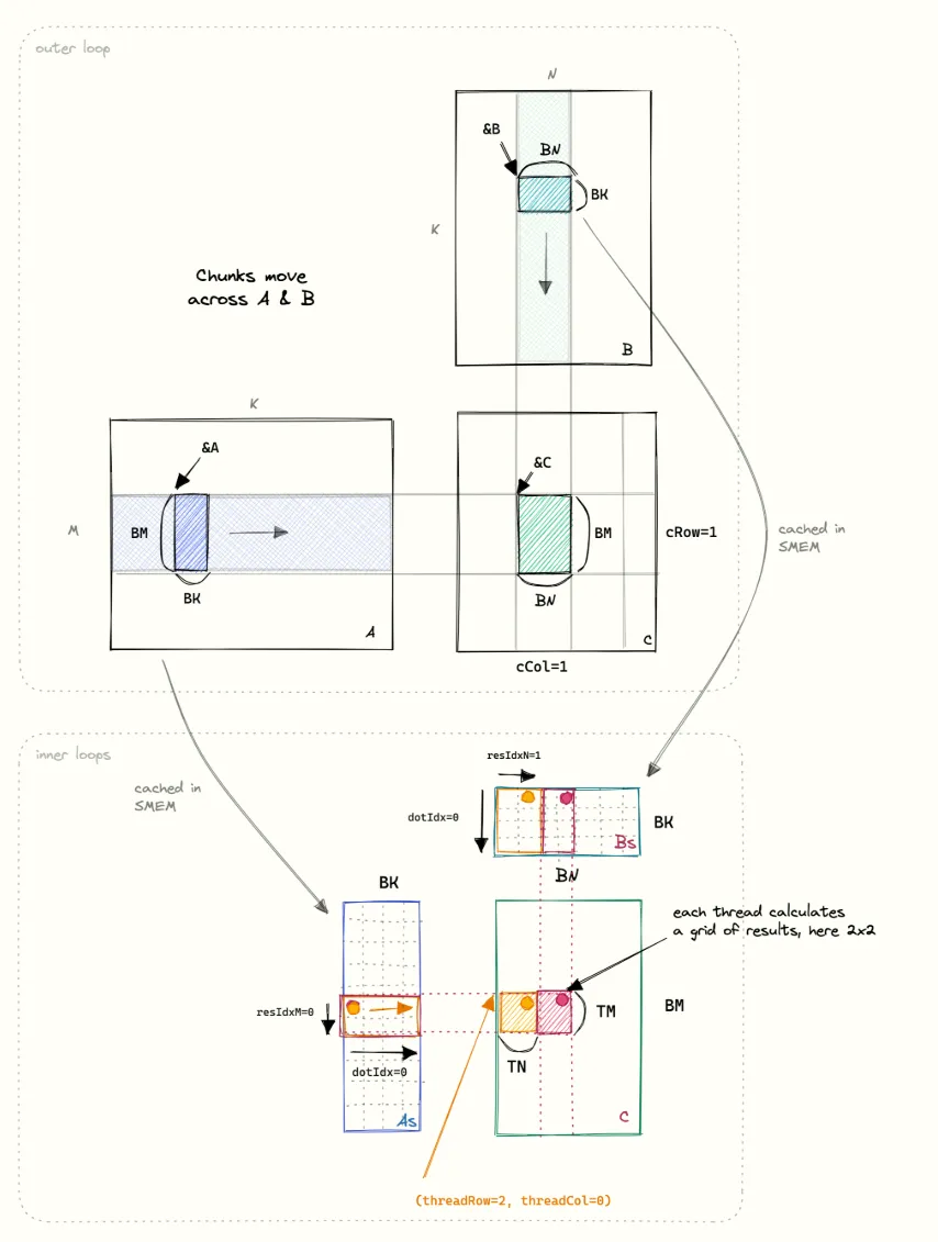 代入 row/col 即得到上述写回索引:(threadRow * TM + resIdxM) * N + threadCol * TN + resIdxN
