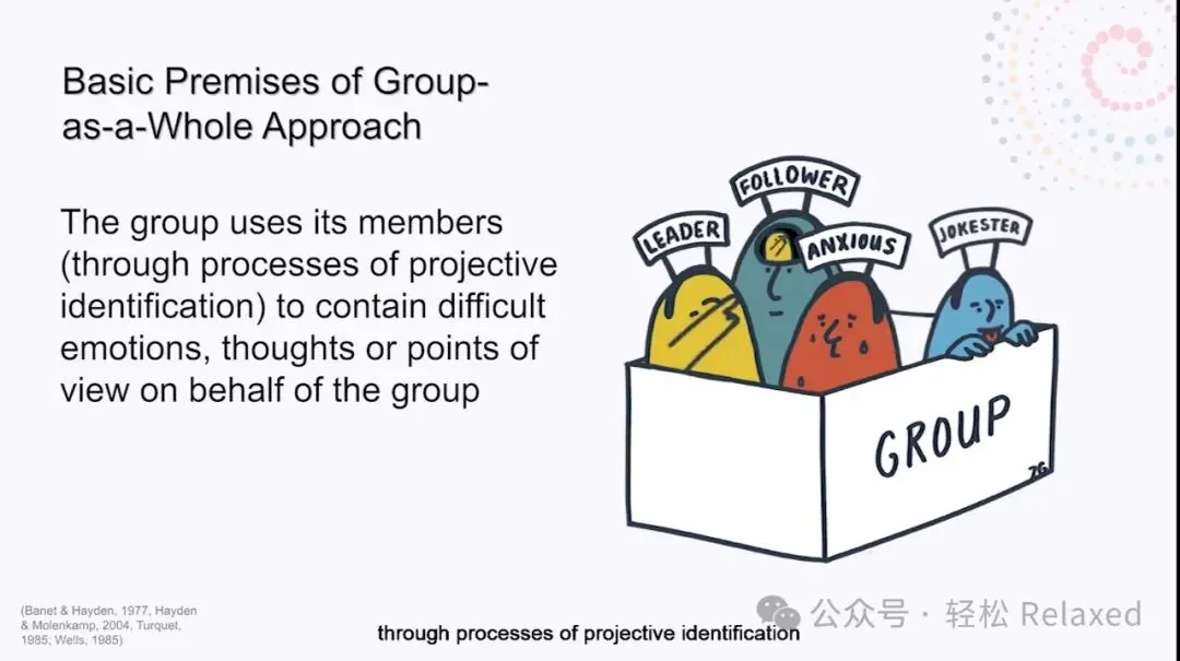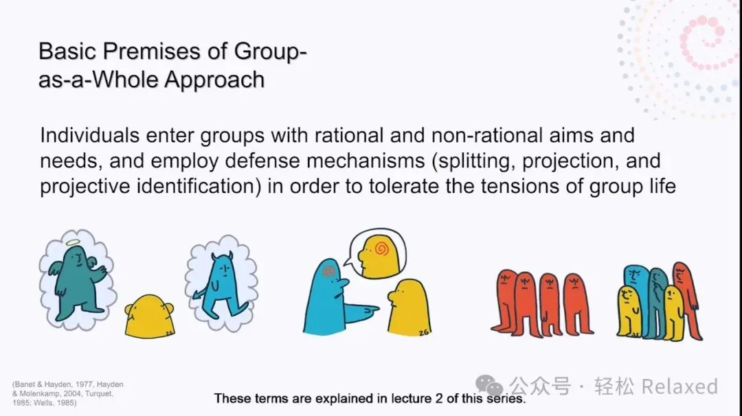 Bion比昂认为,个体成员带着自己个人的理性和非理性的目标和需求进入群体,为了忍受群体生活的巨大张力而使用他们的心理社会防御机制,如分裂、投射和投射性认同。这些术语已在本系列的第二讲中解释。