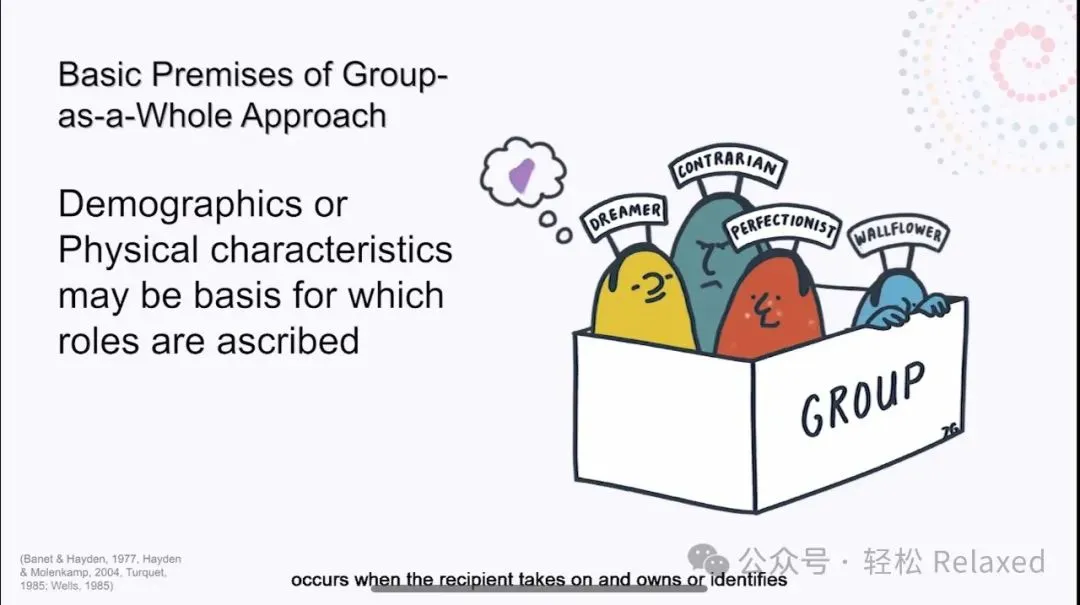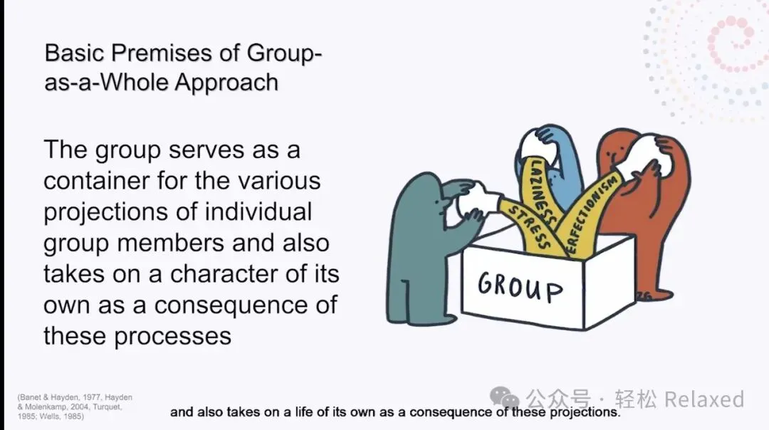 任何团体成员在任何时刻的行为都是他们自己的需求、历史和行为模式的表达,也是整个群体的需求、历史和行为模式的表达。也就是说,个人如何在团体中表现,既与他们自己的个性和在他们世界上的存在方式有关,也与团体对他个人的影响有关。