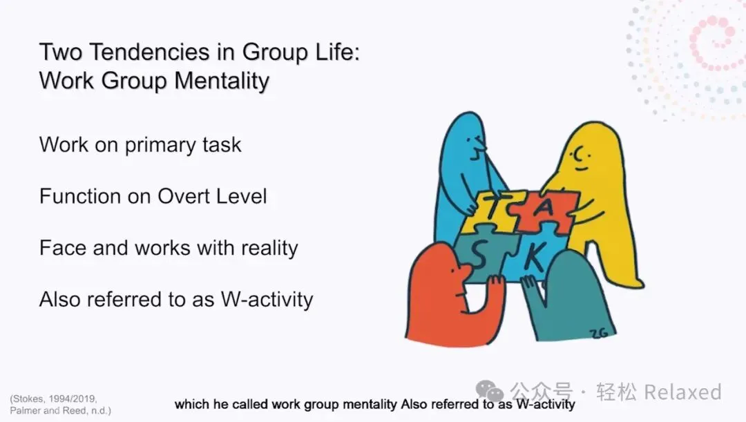 第一种是倾向于完成一项主要任务或面对一个公认的现实并与之工作,他称之为工作团体心态。帕尔默和里德两位心理学家也将其称为W活动或工作活动。