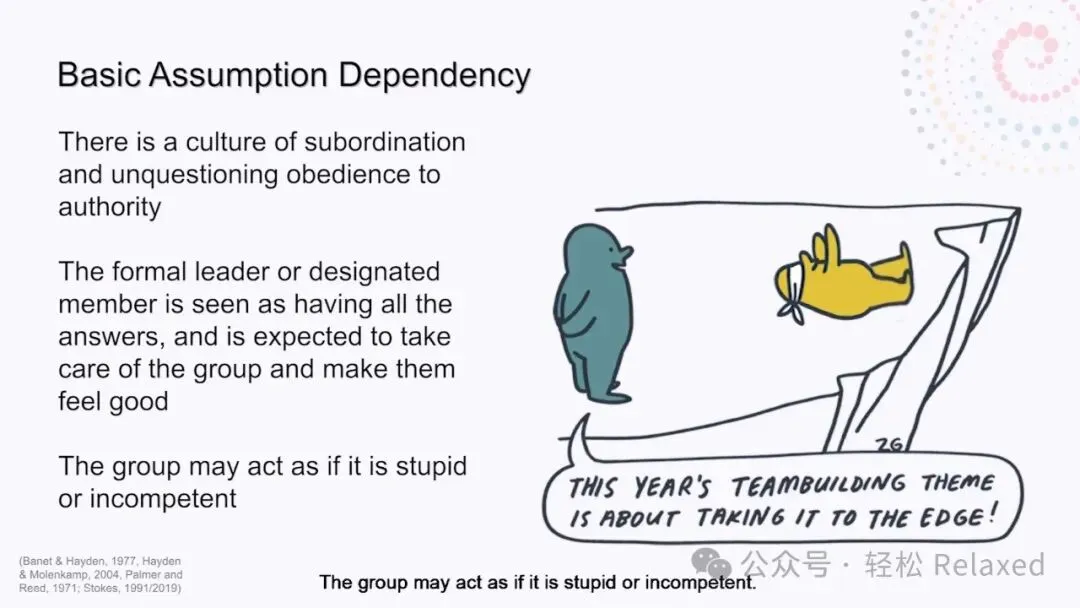 在 dependency group 依赖性的团体中,有一种服从和无条件服从权威的文化。正式领导者或指定成员被视为拥有所有答案,并被期望照顾该团队。这个团体可能会表现得愚蠢或无能。这种病理形式的依赖会抑制生长和发育。