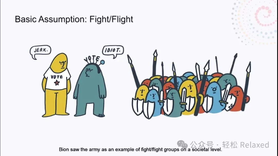 Bion比昂将军队视为社会层面上战斗逃跑团体的一个例子。在这种情况下,s或生存活动被用来推进小组的任务。