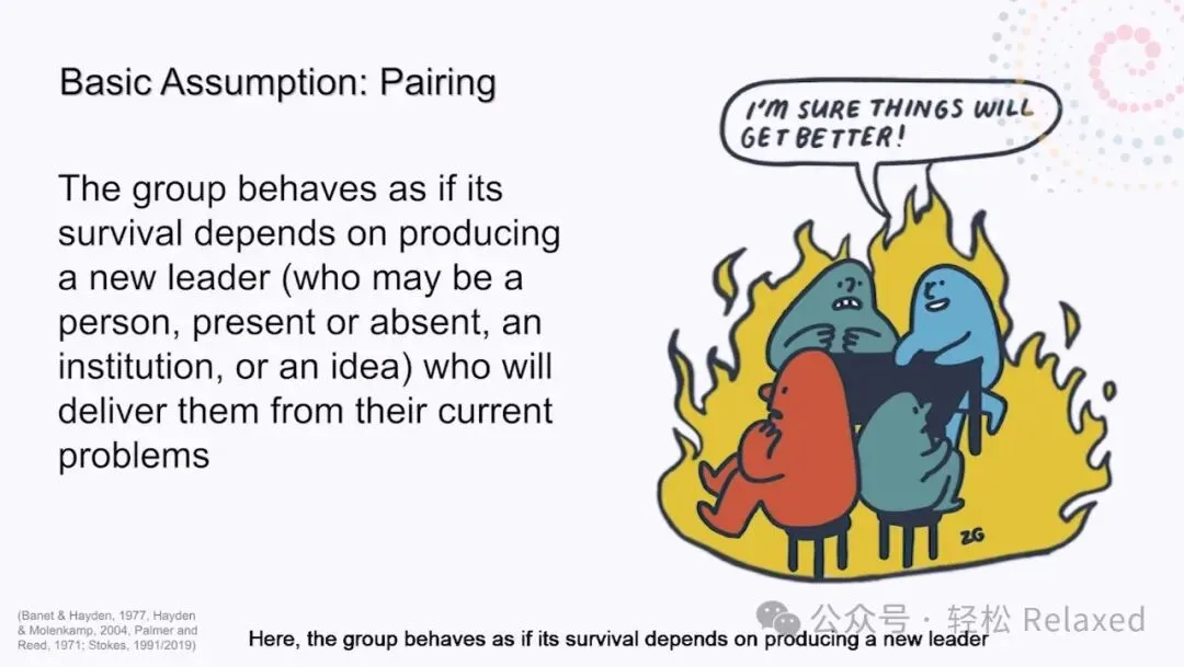 团体的第三种基本假设是配对。在这里,团体的行为就好像它的生存取决于产生一个新的领导者,这个领导者可能是机构中的一个人,也可能是一个能让他们摆脱当前问题的想法。