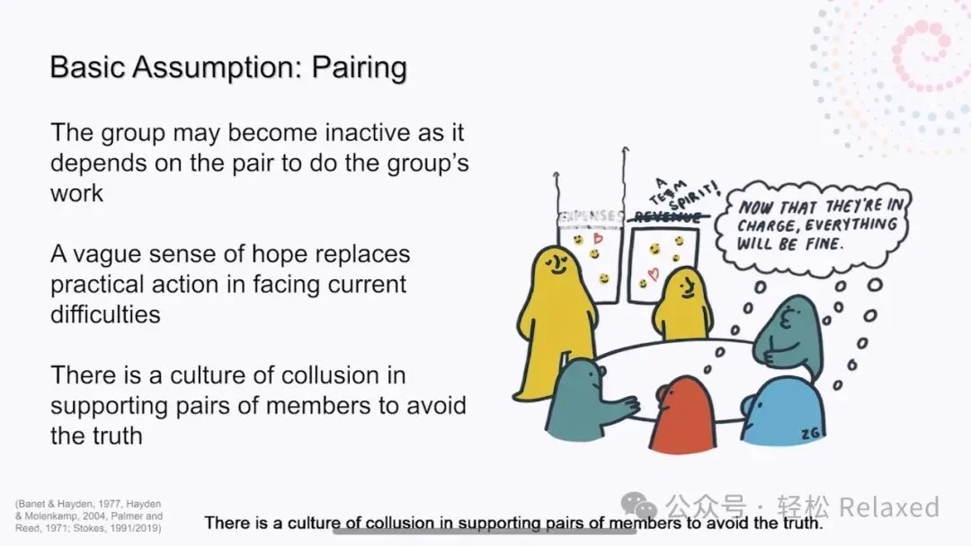 该小组可能会变得不活跃,因为它依赖于这对搭档来完成小组的工作。面对当前的困难,模糊的希望感取代了实际行动。有一种共谋的文化,支持成对的成员回避真相。