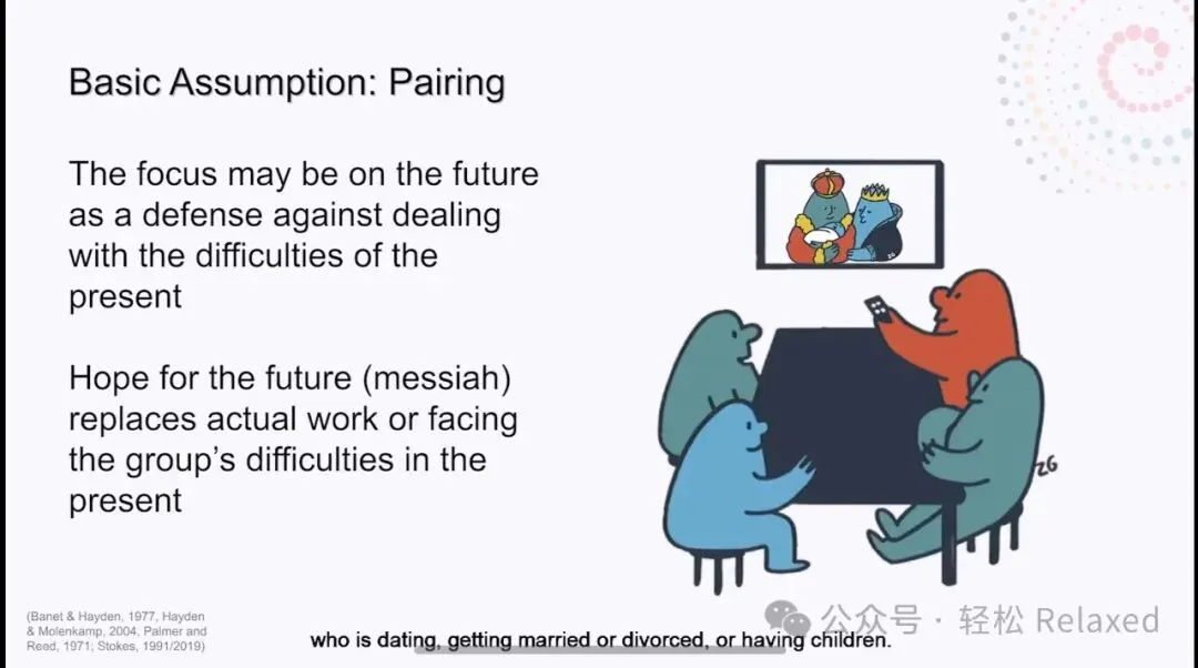 该团体的重点可能是未来的某个实体,作为应对当前困难的防御。团体通常会产生成对的成员,他们被视为这个新的隐喻救世主的可能的父母。