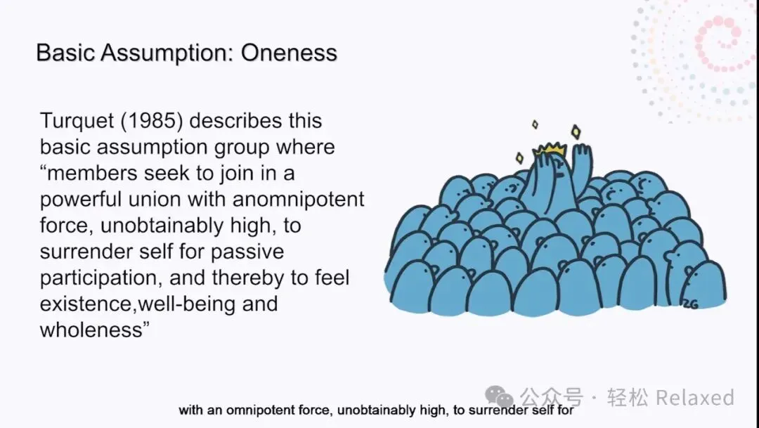 心理学家Turquet补充的第四个基本假设团体,描述了一个这样的团体,成员寻求加入一个强大的联盟,这个联盟拥有一种无法形容的强大力量,为了被动参与而放弃自我,从而感受到存在、幸福和完整。