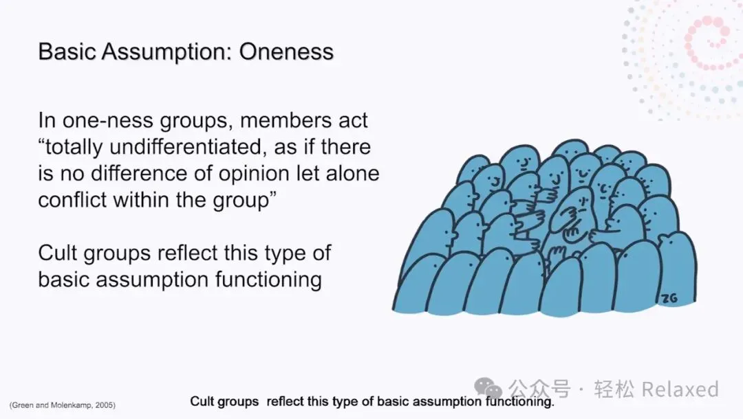 在合一性群体中,成员的行为完全没有区别,就好像没有不同的意见,更不用说群体内部的冲突了。邪教团体反映了这种基本假设团体的运作。