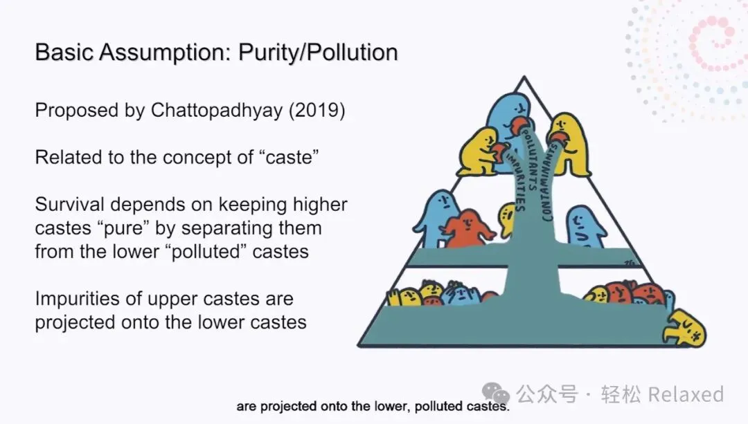 Chattopadhyay在2019年提出了与种姓概念相关的第六种基本假设:纯净/污染。种姓等级制度确立了一个主导团体相对于另一个团体的优越性或纯洁性。基本假设纯度/污染 团体的行为就像它们的生存取决于保持更高等或更纯净的团体,与更低等、被污染的团体分开。根据这一基本假设,上层种姓的不纯净被投射到下层被污染的种姓上。Chattopadhyay还指出,对纯度和污染的假设可能基于阶级、性别、性取向或宗教。