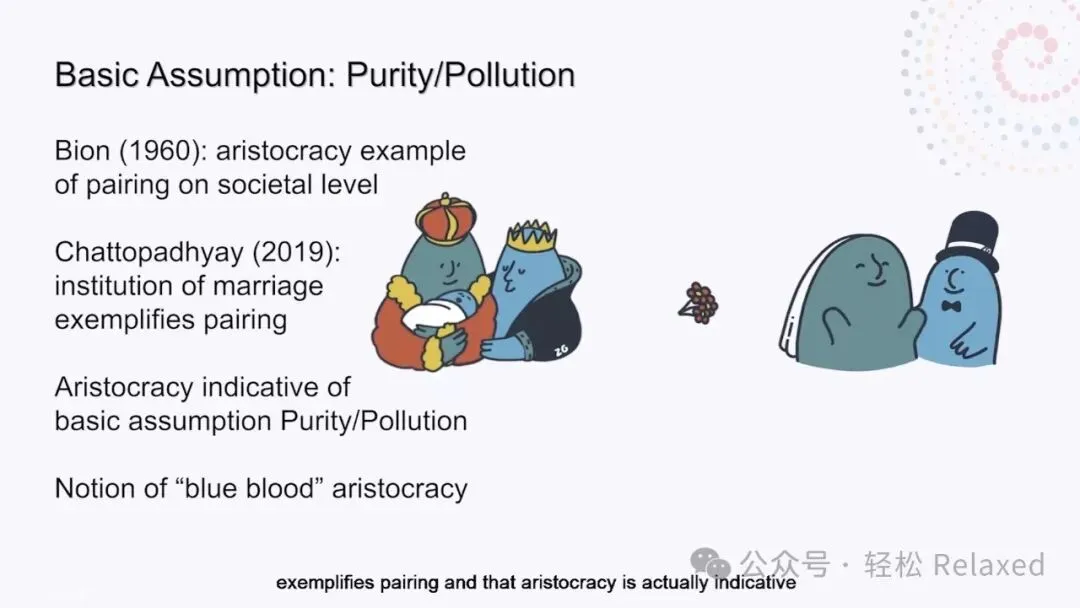 在本次讲座的早些时候,我提到Bion比昂认为贵族是社会层面基本假设配对的一个典型例子。相比之下,chattopadhyay提出,婚姻制度体现了配对,贵族实际上表明了基本假设的纯洁/污染。即使在法国、西班牙和德国等国宪法废除君主制后,贵族拥有必须保持纯洁的蓝血的概念仍然存在。