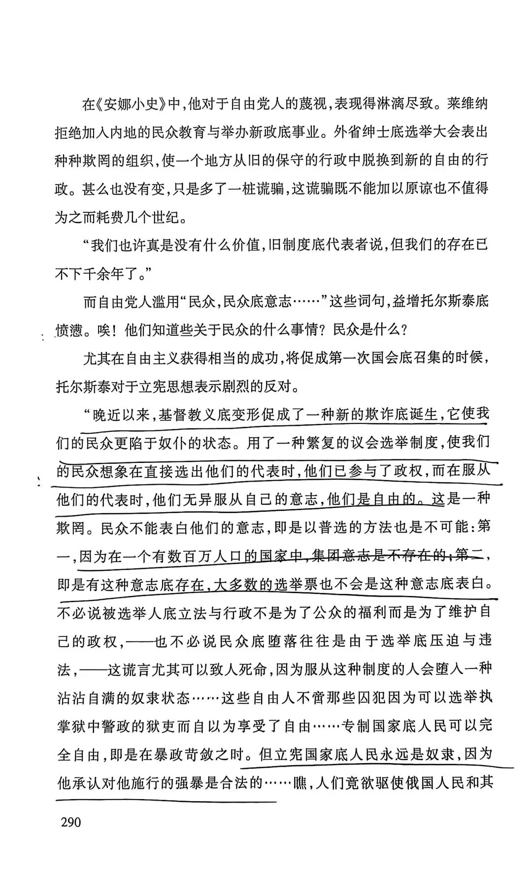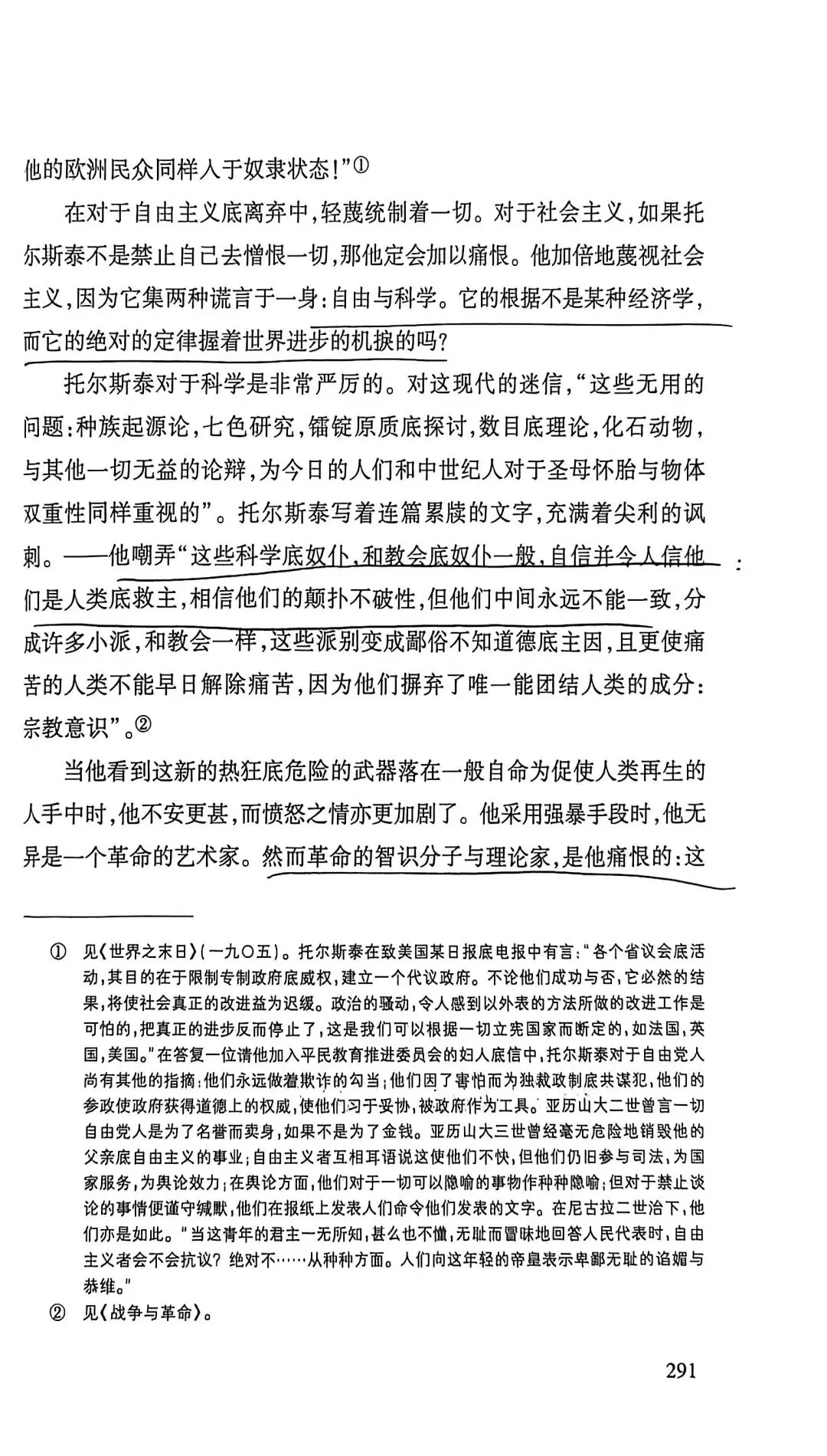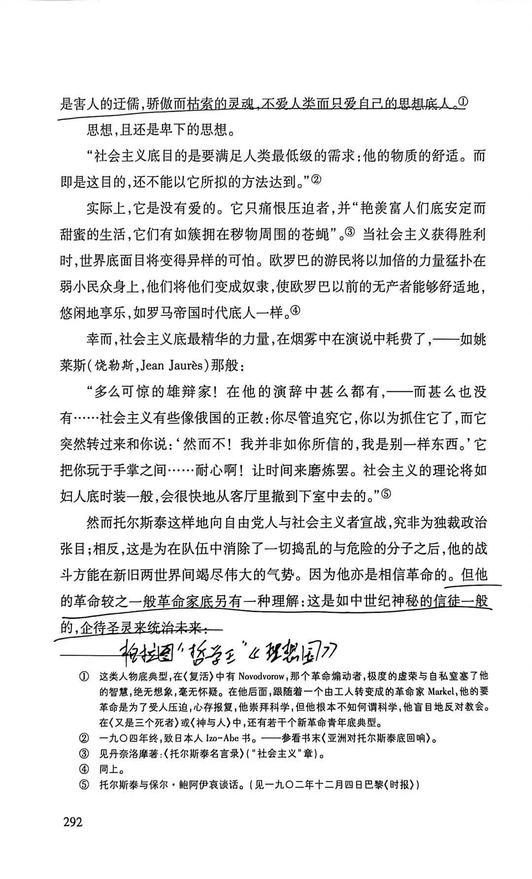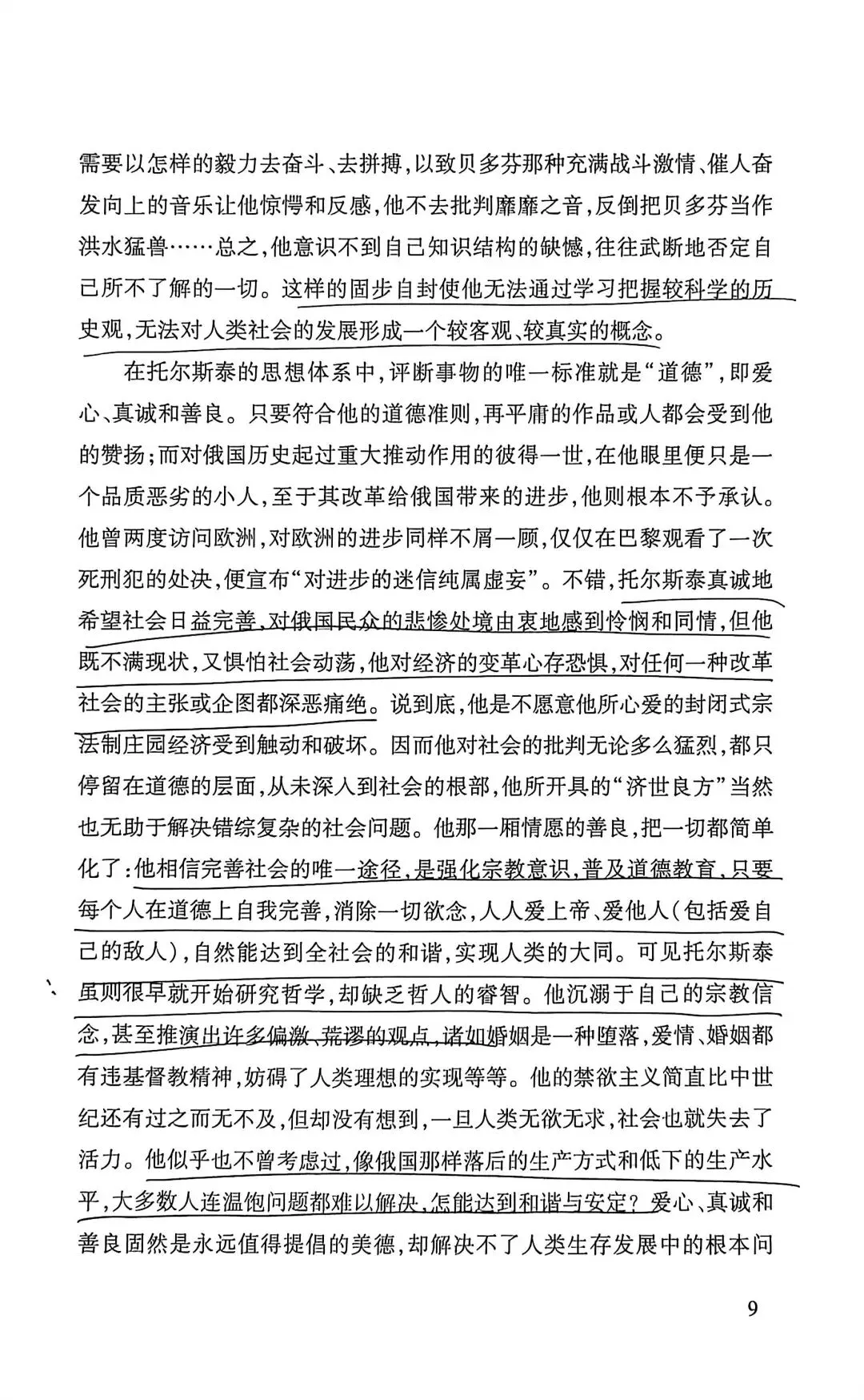 托尔斯泰家庭出生最为优越,他偏执、对信仰的狂热类似宗教的狂迷,批判抽象的爱。认为只有劳苦大众才有知识智慧,这是一种偏见,一类人当中就有有好有坏。他批判宪政自由主义(选票不能代表大众的声音,而成为合法奴役大众的依据),也批判SH主义,资本主义的堕落。他的内心不断受到良心的谴责,因为他的道德要求太高了。托尔斯泰也认为死亡具有积极的意义,有死亡才能称之为幸福。他深受卢梭启蒙思想的影响。他批判不劳而获,有钱未必是罪恶。《论语》子贡曰:“贫而无谄,富而无骄,何如?”子曰:“可也。未若贫而乐,富而好礼者也。”