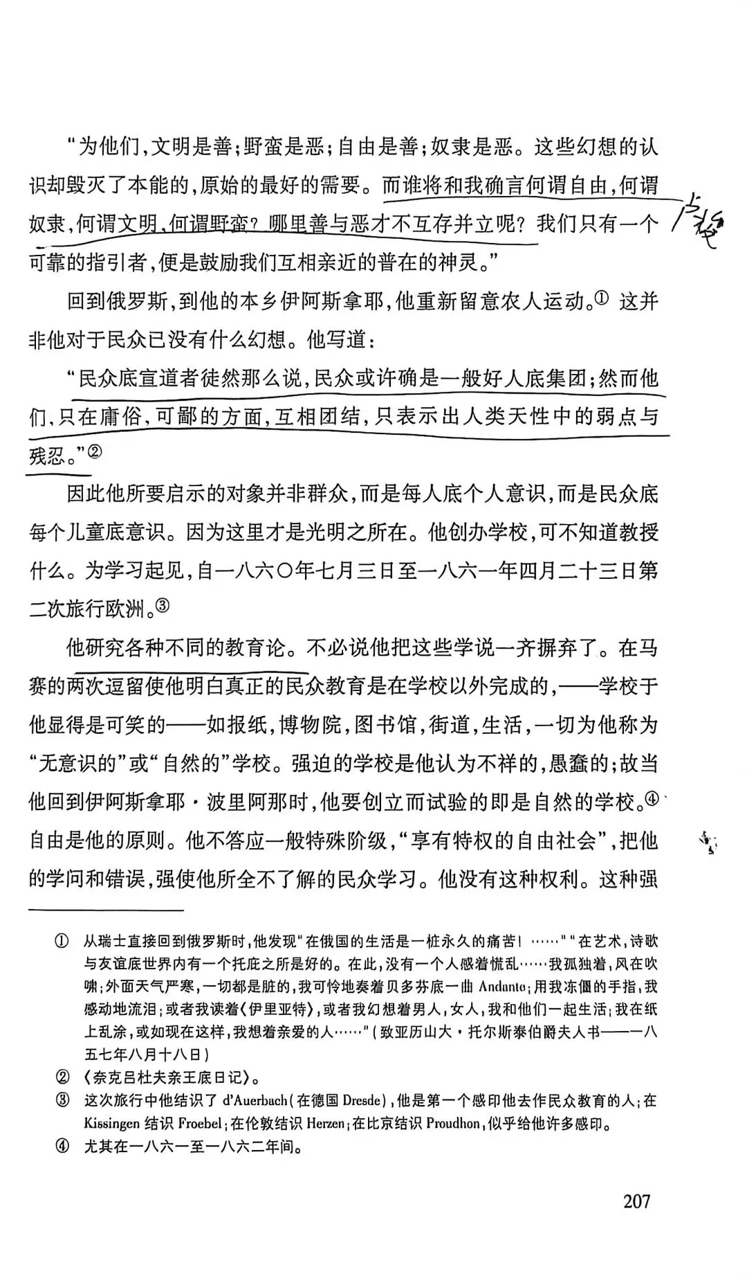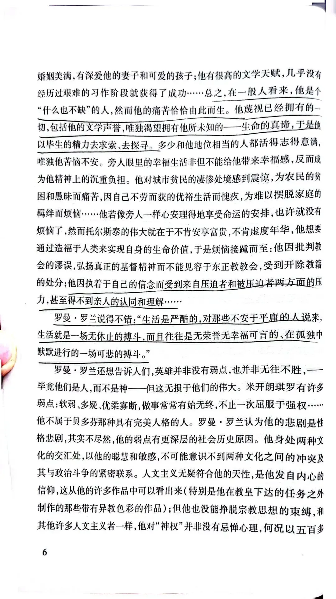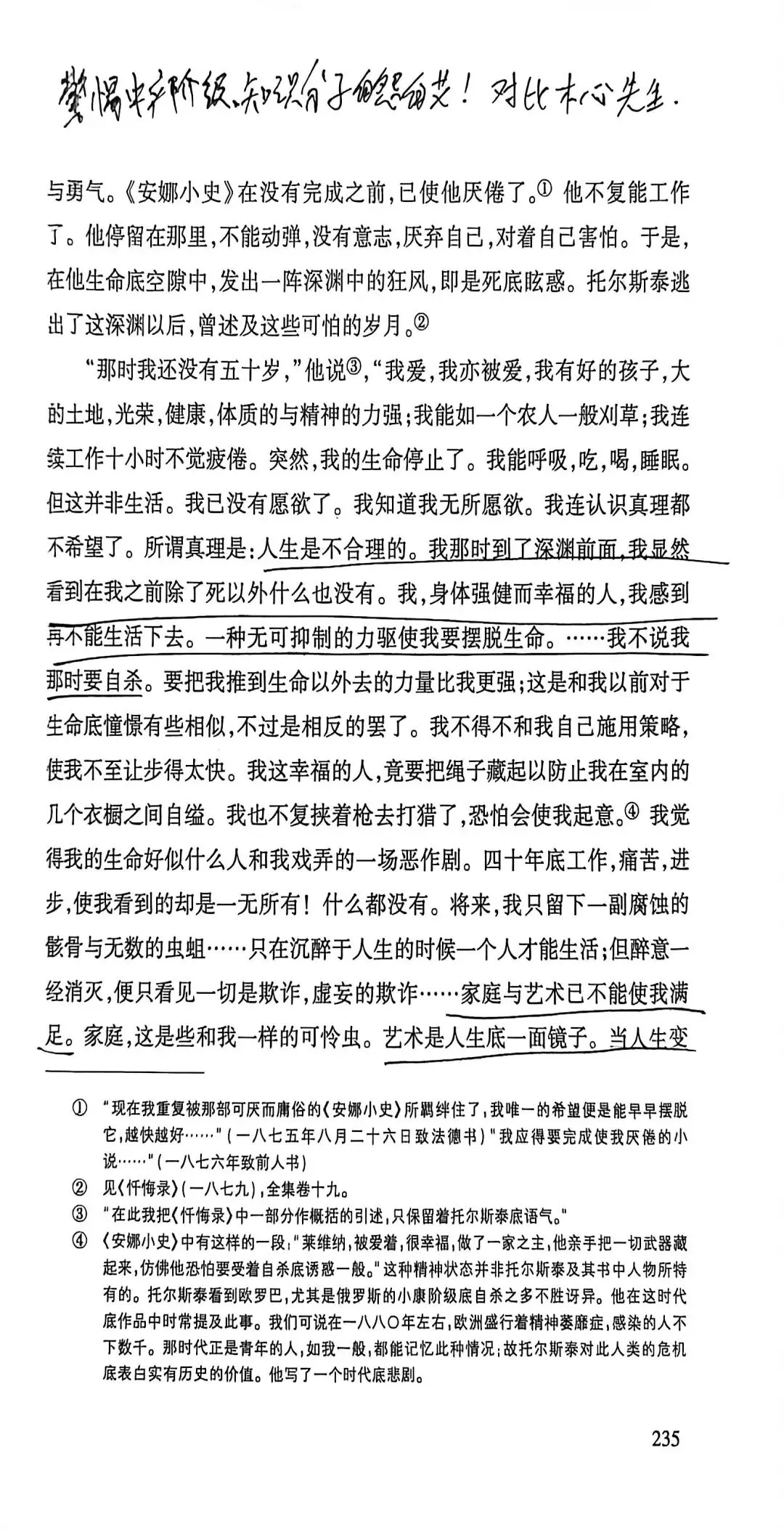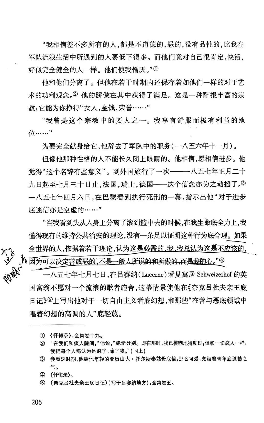 托尔斯泰家庭出生最为优越,他偏执、对信仰的狂热类似宗教的狂迷,批判抽象的爱。认为只有劳苦大众才有知识智慧,这是一种偏见,一类人当中就有有好有坏。他批判宪政自由主义(选票不能代表大众的声音,而成为合法奴役大众的依据),也批判SH主义,资本主义的堕落。他的内心不断受到良心的谴责,因为他的道德要求太高了。托尔斯泰也认为死亡具有积极的意义,有死亡才能称之为幸福。他深受卢梭启蒙思想的影响。他批判不劳而获,有钱未必是罪恶。《论语》子贡曰:“贫而无谄,富而无骄,何如?”子曰:“可也。未若贫而乐,富而好礼者也。”