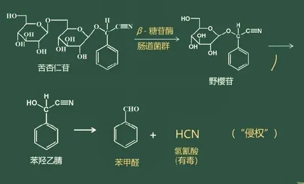 (1)水解三部曲:苦杏仁苷 → (酶/酸水解) → 野樱苷 → (进一步水解) → 苯甲醛(特殊香味) + 氢氰酸(HCN)。
