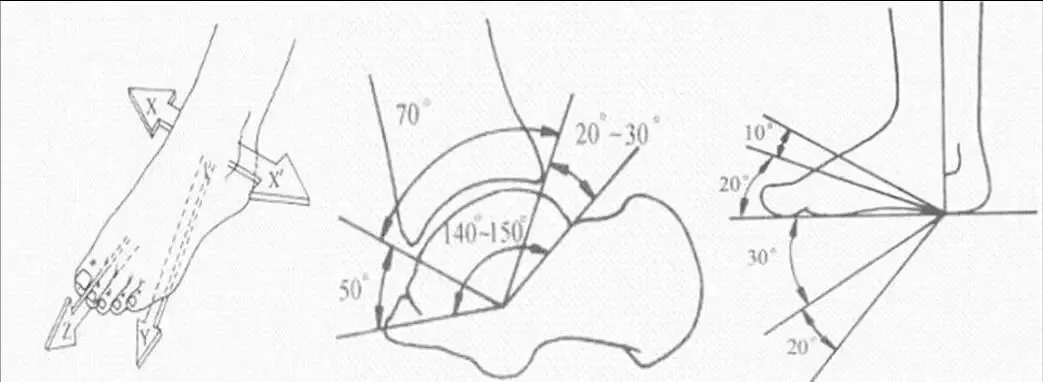 1.运动方向:跖屈(绷脚尖);背伸(勾脚尖);正常背伸至70°,跖屈至140°,约有70°的活动范围;绕足的矢状轴: 内翻及外翻。