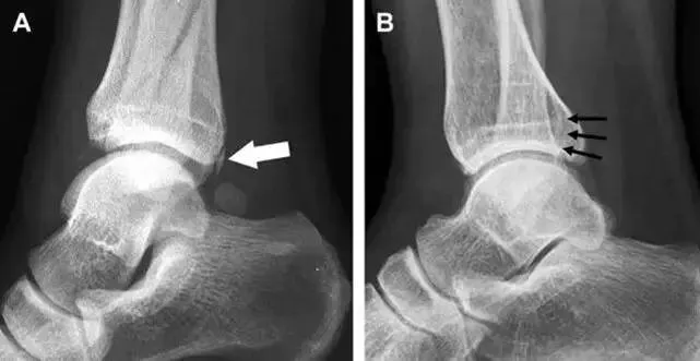 (如图)后踝骨折。A-侧位片示来源于胫骨后踝的一个小骨折碎片(箭头),因踝部扭伤导致;B-另一位跖屈损伤的患者,侧位片示一个大骨折块(箭头)。