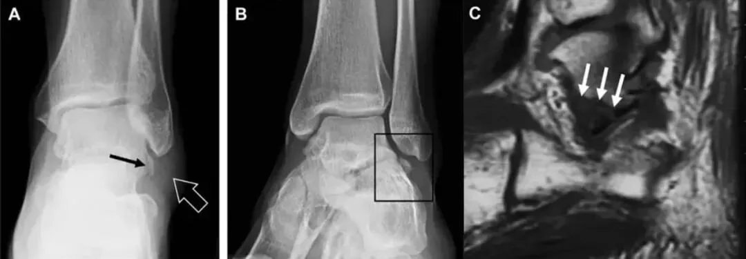 A-正位片示内翻损伤所致的距骨外侧突撕脱性骨折(箭头)。