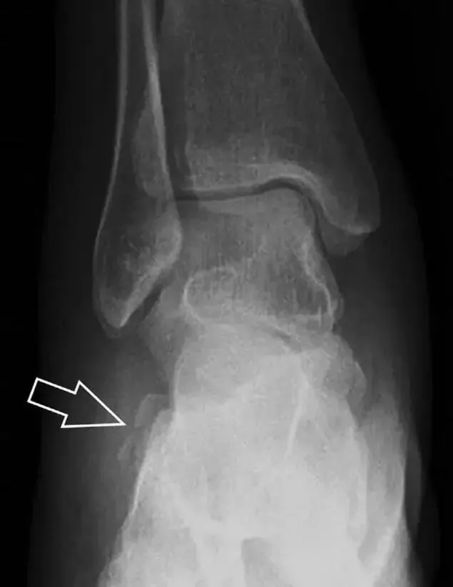 (如图)溜冰受伤的患者,趾短伸肌跟骨撕脱性骨折。正位片示 2 个骨折块(箭头)来源于跟骨前外侧、趾短伸肌的起点处。踝关节外侧远端是否存在软组织水肿是一个重点观察点 。