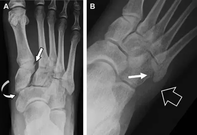 典型表现:第二跖骨底和内侧楔骨之间的骨折碎片,跖骨间间隙增宽,脱位亦可发生在舟骨-内侧楔骨关节,导致另一种变异的跗跖关节损伤(图A)。此外,骰骨的小块皮质撕脱在足部斜位片上可清晰显示(图 B)。
