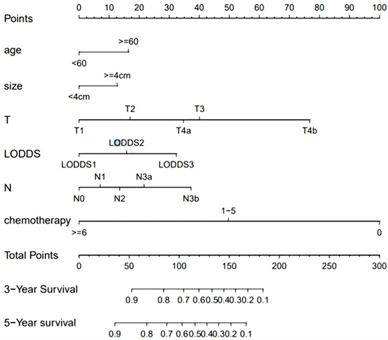 | 列线图 alignment diagram 又称诺莫图 nomogram通过构建多因素回归模型,根据模型中各个因素对结局变量的贡献程度(回归系数的大小),给每个影响因素的每个取值水平进行赋分,然后再将各个评分相加得到总评分,最后通过总评分与结局事件发生概率之间的函数转换关系,从而计算该个体结局事件的预测值。②得分,包括单项得分point和总得分total point;③预测概率,n-year survival prob。 |