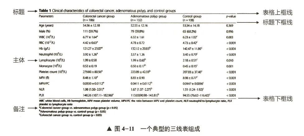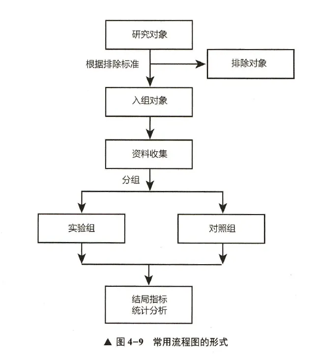 在临床研究中,我们用框来表示研究的人群、临床资料的内容、纳人排除的标准、研究方法和评估措施,而带箭头的线则可以用来表示分组或治疗等经过。三线表是学术期刊中表格的主要形式,所谓三线表,其三条线分别是表格上边框、横标题下边框、表格下边框;但有一些复杂表格内不止三条线, 三线表是一种统称,其原则是表格内不能有竖框线,相同内容之间不能有横框线。一个完整的三线表应该包括表格标题、表格主体和备注。表格主体内通常包含变量、分组、例数、数值、统计量和P 值等元素。