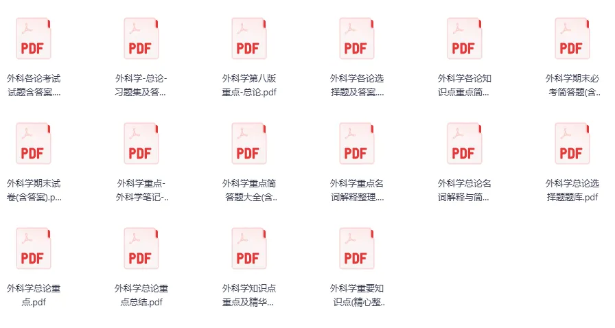 今天分享的资料是「0004-外科学」电子版+学习笔记+知识点总结+期末考试重点+复习资料+习题集及答案+名词解释+历年真题试卷及答案+题库及答案+复习重点+思考题及参考答案+公式总结+考试重点基础题+知识总结+高清PDF可打印+免费分享!