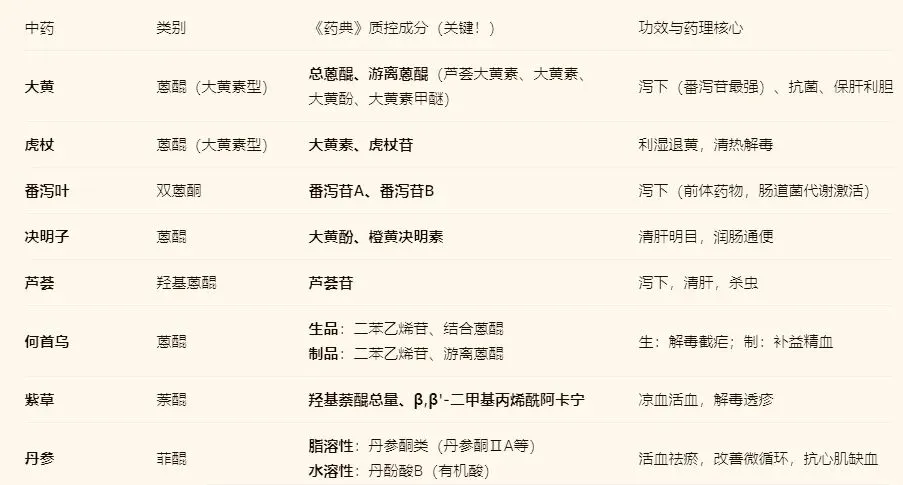 (紫草、丹参、大黄、虎杖、番泻叶、决明子、芦荟、何首乌)