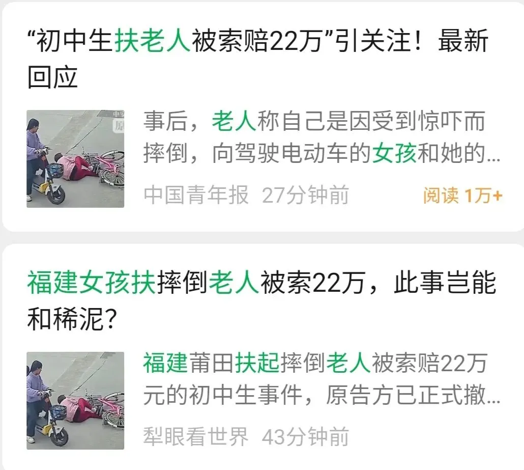多家媒体都是这么描述这一事件的:福建一老太太骑车摔倒,两初中生经过好心扶起,结果被交警定了次责,初中生遭索赔22万。新闻报道由头中短短几句话,描述出一个让人义愤填膺的冲突框架:恶意满满的老人,天真无邪的孩子,糊涂至极的交警,绝望心痛的母亲,22万索赔击碎的人心,堵在公众心中的巨大阴影。"初中生扶老人遭索赔22万”的标题和报道,在舆论场激起一波对老人、交警、判罚、道德的巨大敌意。