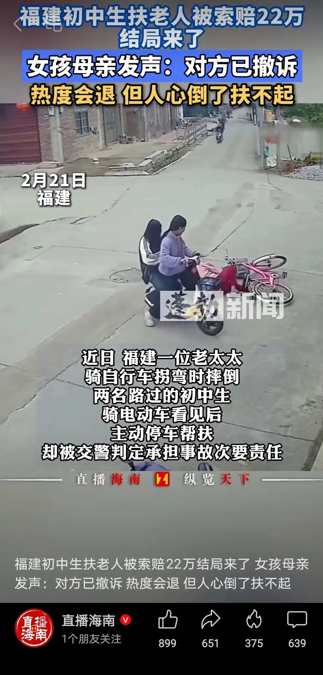 还好,有现场视频和交警的事故认定书。基于交警事故认定书及视频,新闻报道应该这么写:福建一骑车老人称避让拐弯电动车时摔倒,交警认定电动车次责。从现场视频看,骑电动车的是两个初中女生,她们扶起了摔倒的老人。据孩子母亲称,老人称被电动车吓摔倒的,找其索赔22万。她认为老人是在避让另一辆白色轿车,女儿是做好事才伸出援手,追责给孩子造成严重的心理阴影。