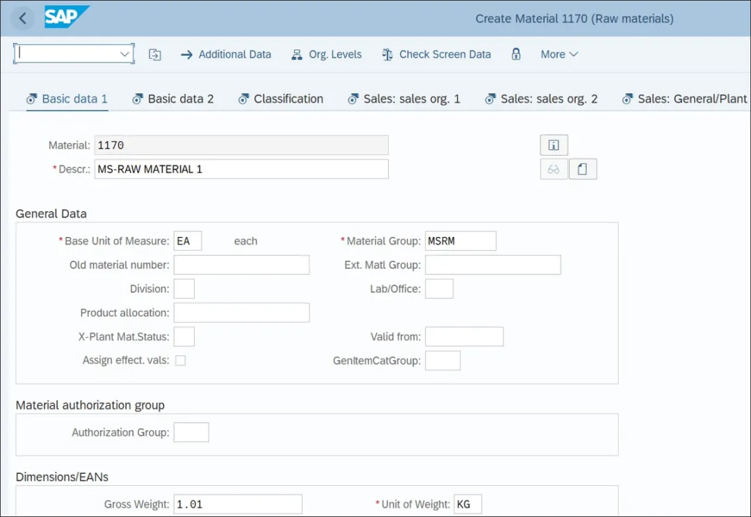 在创建物料主数据组织层级屏幕上按(Enter)键后,将显示基本数据 1 视图。从该视图中,您可以通过点击顶部的标签导航到其他数据视图。有两个视图(屏幕)用于维护物料的基本数据视图。下图显示了物料主数据的基本数据 1 视图。此视图中的关键字段如下:此值唯一标识一个物料主数据记录。如果您未为物料指定外部唯一编号,系统将根据分配给物料类型的内部编号范围分配一个内部编号。在此字段中,输入物料项目的描述,长度最长为 40 个字符。您可以通过点击“附加数据”按钮维护物料的不同语言的附加描述。为物料指定一个基本计量单位。物料库存以此计量单位进行管理。对于每个物料,基本计量单位是必填项。您可以维护替代计量单位,但系统必须维护将替代计量单位转换为基本计量单位的换算系数。点击“附加数据”以维护物料的替代计量单位并设置其换算系数。部门是一种对物料进行分组的方式,用于确定销售区域和业务区域。在此为物料指定一个部门。部门在配置中定义。要定义部门,请执行事务 SPRO 并导航至后勤 - 常规 • 物料主数据 • 关键字段设置 • 定义部门。下图显示了系统中定义的部门。物料组用于对具有相似特性/属性的物料进行分组。在此为物料指定物料组。在此为物料指定一个外部物料组。物料可以与外部物料组关联,以便从外部唯一标识物料组。UNSPSC 是最常用的商品编码系统,用于从外部标识物料组。您可以在配置中定义外部物料组。要定义外部物料组,请执行事务 SPRO 并导航至后勤 - 常规 • 物料主数据 • 关键字段设置 • 维护外部物料组。指定在旧系统中维护的物料的旧物料编号。在部署期间将物料主数据从旧系统转换为在 SAP S/4HANA 中使用时,此字段很有用。在此为物料指定一个通用项目类别。项目类别组在确定参照销售订单或库存转储订单创建的外向交货的项目类别时起着至关重要的作用。例如,NORM 是标准项目的项目类别组。在此字段中,分配适用于所有工厂的物料状态。在供应链中,物料状态起着至关重要的作用。它定义了物料是否可以自由使用、正在开发中或已过时。如果物料处于活动状态,请输入生效日期。在此字段中,为物料分配授权组,这是一个四位字母数字代码。您可以为物料组和物料类型定义不同的授权组。如果已维护,系统将从相应的物料组或物料类型复制授权组。在基本数据 1 视图中,您可以为物料维护毛重和净重字段,以千克(KG)、磅(LB)、克(G)等单位输入重量,并且可以在体积字段中以适当的单位输入体积。下图显示了为类类型 001 维护的物料主数据的分类视图。物料的分类视图可以针对以下一种或多种类类型进行维护:分类视图中只有一个关键字段:类字段,您可以在此字段中为物料分配一个类。您可以在此字段中分配物料类或批次类。如果您要维护物料类,请分配为类类型 001 的物料定义的类。如果您要维护批次类的分类视图,请分配为类类型 023 定义的类。可以在 SAP S/4HANA 中使用事务 CL02 使用特定的类类型创建一个类,并且您还可以定义特性/属性来维护物料主数据。系统会自动默认分配给物料的类中定义的特性。您可以根据业务需求维护这些特性的值。你若喜欢,点个❤️谢先👇