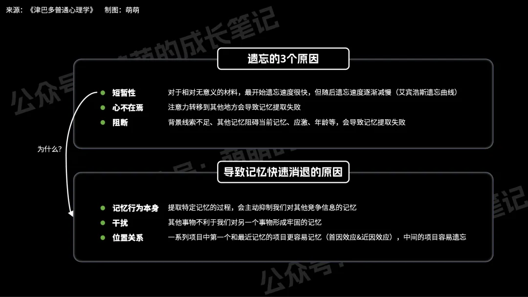 【💡对记忆的干扰有两种类型。前摄抑制,指原有的记忆扰乱了对新信息的学习和记忆。倒摄抑制,指新信息阻止对原有信息的记忆。】