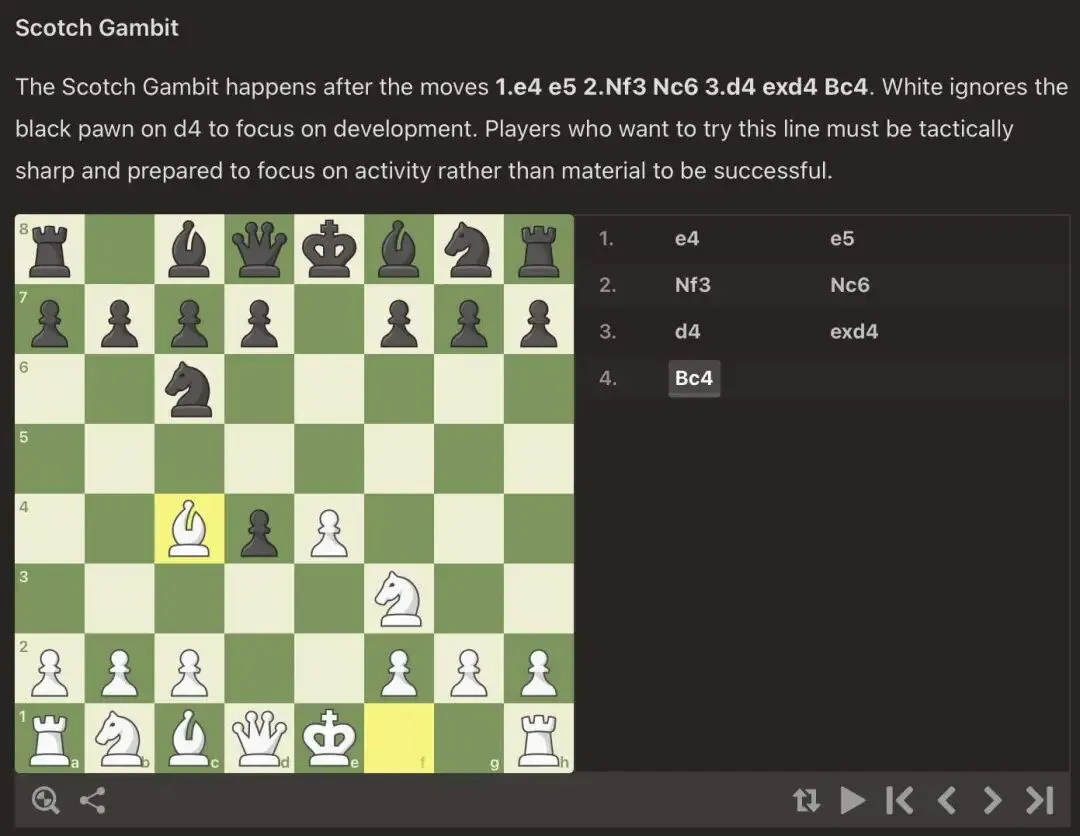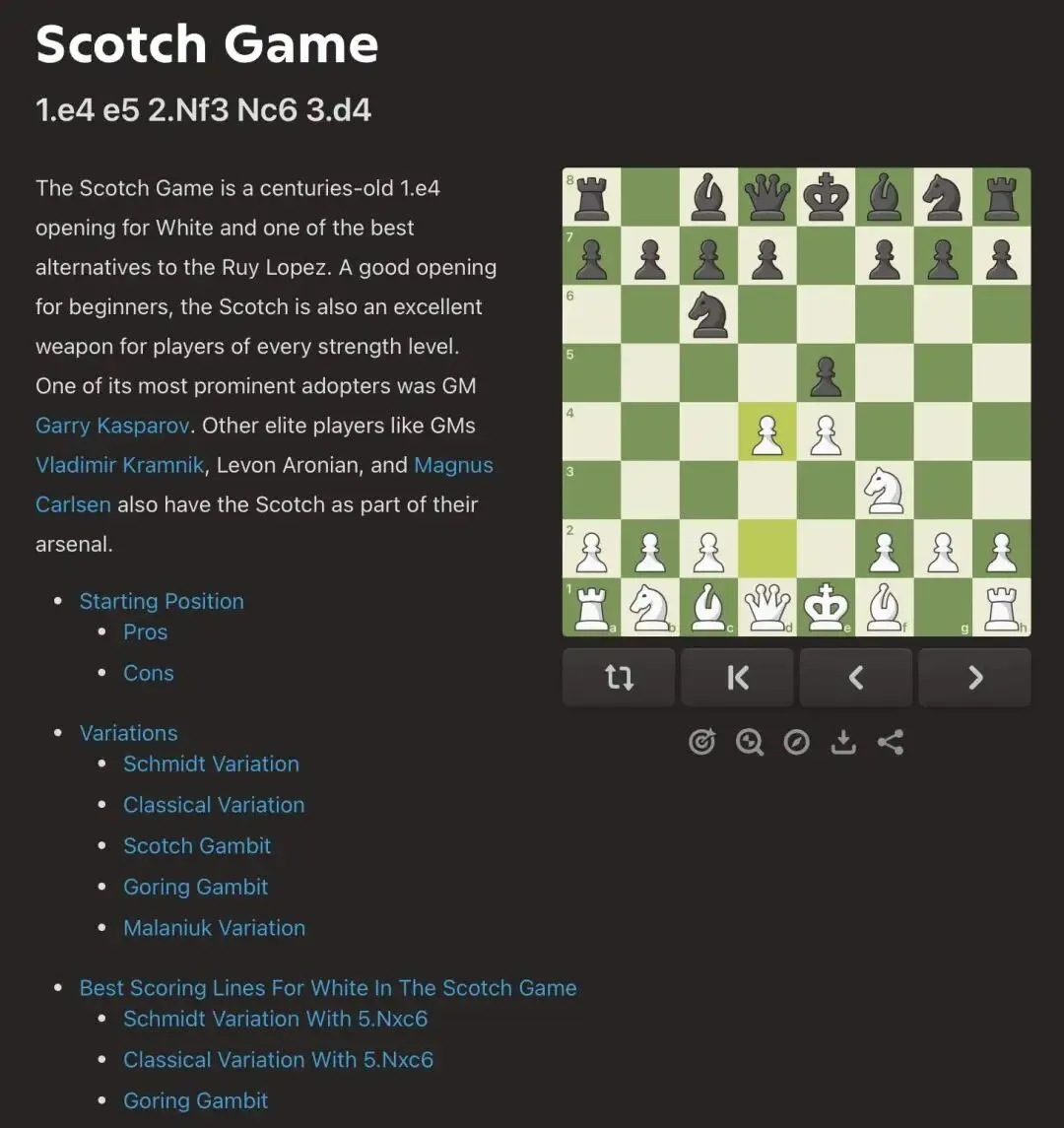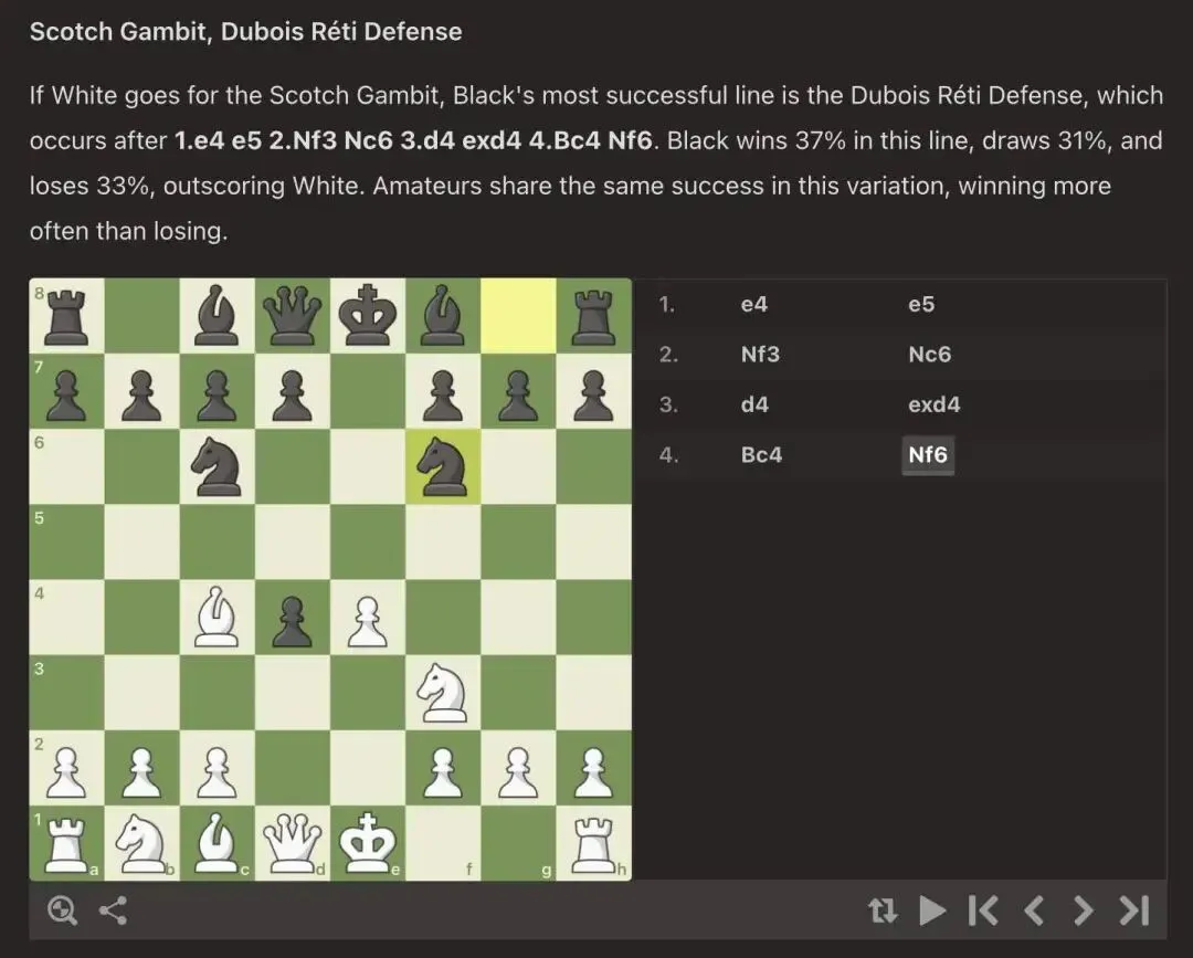 2)根据对手的行动做出合理反应。因为Scotch Game后续变化太多,千万不能硬记走法,万一记串了就尴尬了。选择当下最符合逻辑的走法,相信自己当下的思考能力而不是棋谱。