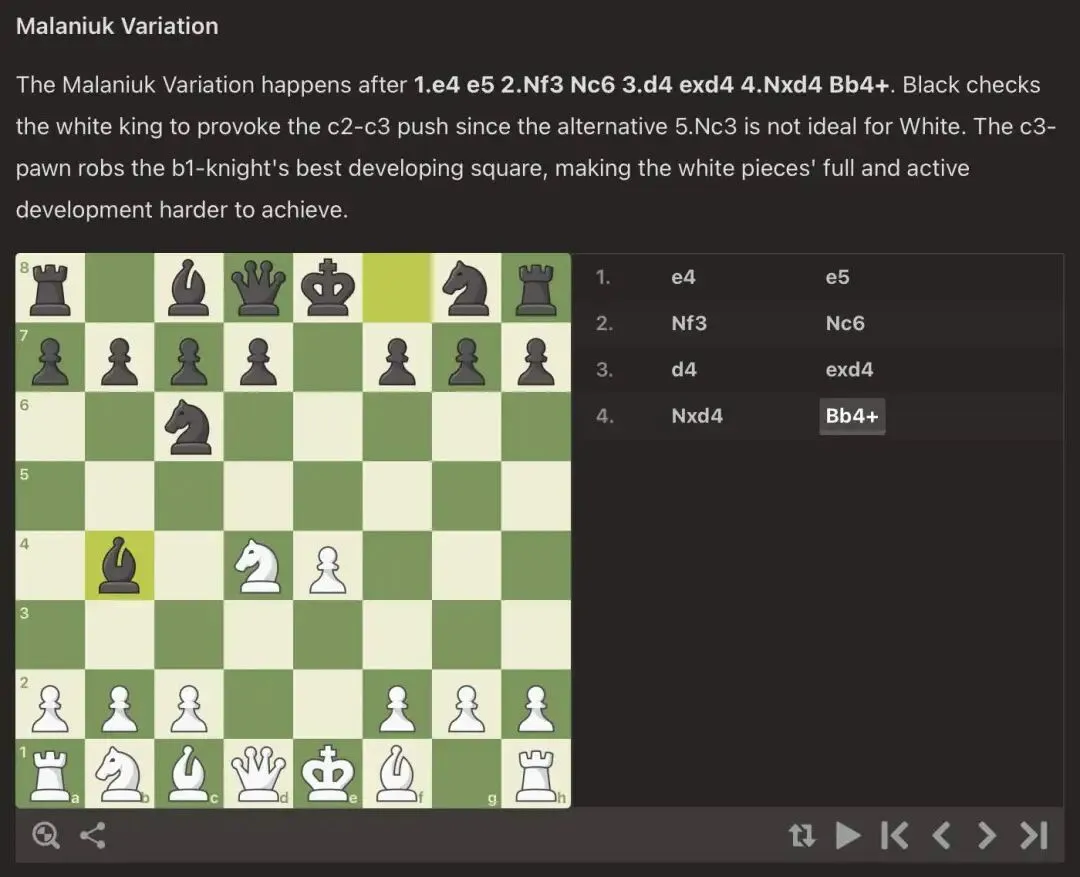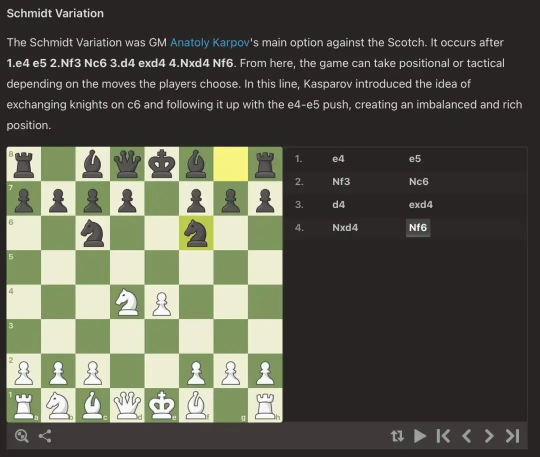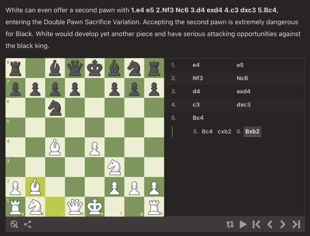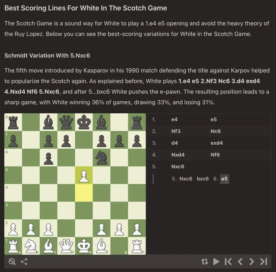 2)根据对手的行动做出合理反应。因为Scotch Game后续变化太多,千万不能硬记走法,万一记串了就尴尬了。选择当下最符合逻辑的走法,相信自己当下的思考能力而不是棋谱。