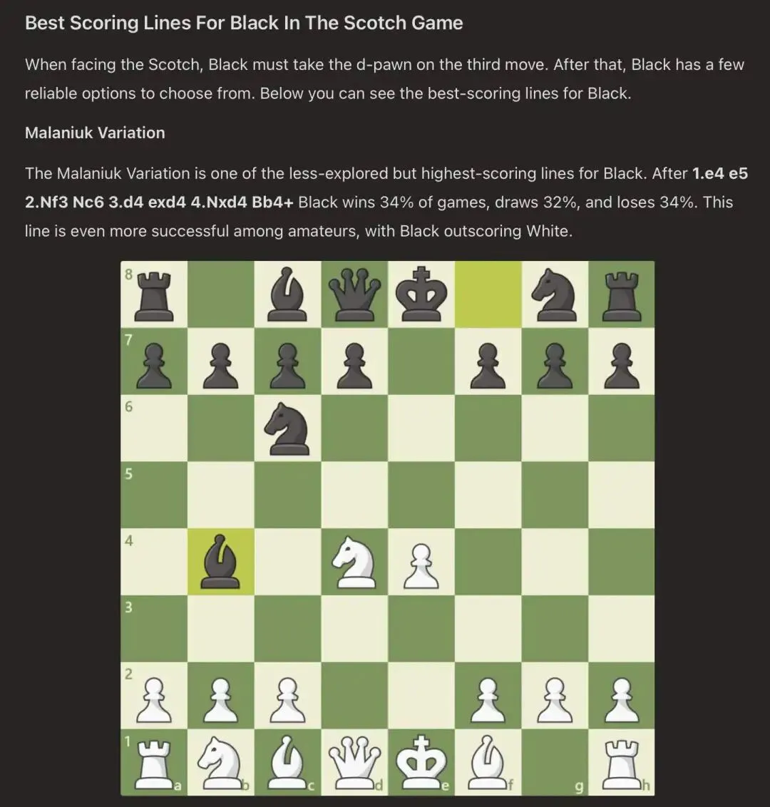 Scotch Game是一个特点非常明显的开放式开局,快速打开中心,快速争夺中心,从第4-5步开始,双方已经咬得非常紧,因此每一步都可能给局势带来很大的影响。