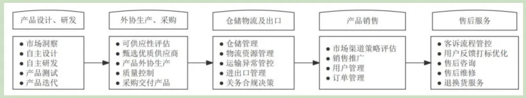 公司通过自主研发设计、 外协生产及采购、 仓储物流及出口、 境内外线上线下销售等业务环节, 将上游供应商、 物流服务商以及遍及全球的下游消费者客户连接起来。公司整个商业模式如下