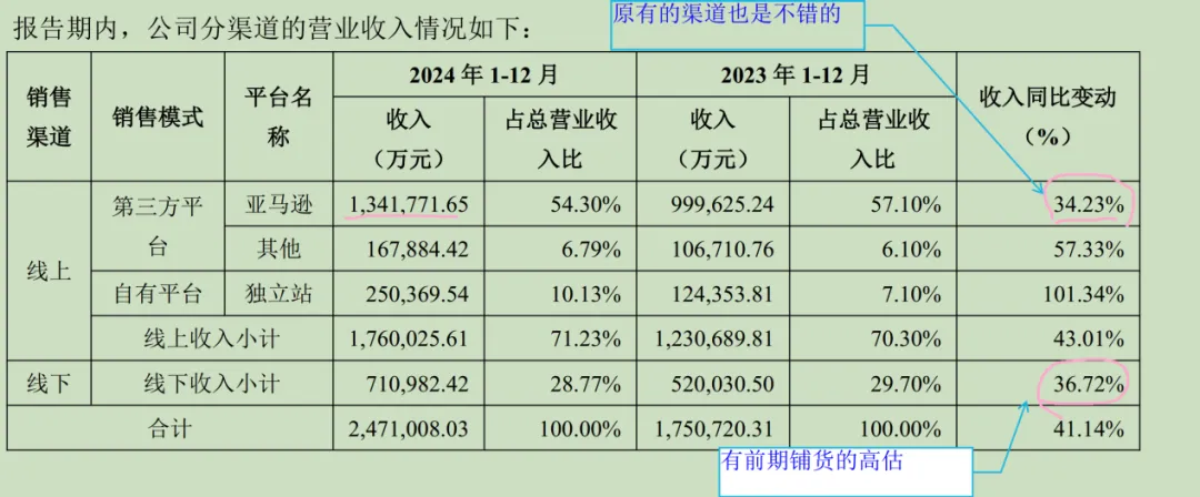 线上销售占比70%,公司凭借在电商领域深耕多年沉淀的线上经营经验, 通过第三方平台与自有独立站双轨并进的精细化运营模式持续扩大市场份额。 公司在第三方平台的销售收入以亚马逊为主, 同时积极拓展京东、 天猫、 速卖通、 eBay、 抖音等主流电商平台的深度合作, 不断探索新的线上业务增长点。线下渠道营收不足30%, 公司依托线上业务积累的品牌影响力及用户口碑, 持续加速构建全球化线下销售网络。 在北美市场, 已成功进驻沃尔玛、 百思买、 塔吉特、 开市客等国际知名零售渠道; 日本市场则与 7-11 等本土零售巨头建立战略合作关系; 欧洲、 澳大利亚及东南亚等区域市场亦通过拓展深化渠道布局,新增多个合作渠道。