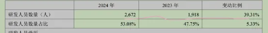 公司2024年研发人员增加很快,公司明确以技术创新为核心战略,2024 年持续加码研发投入,全年研发费用达 21.08 亿元,同比增长 49.13%,占营收比重提升至 8.53%,创历史新高。