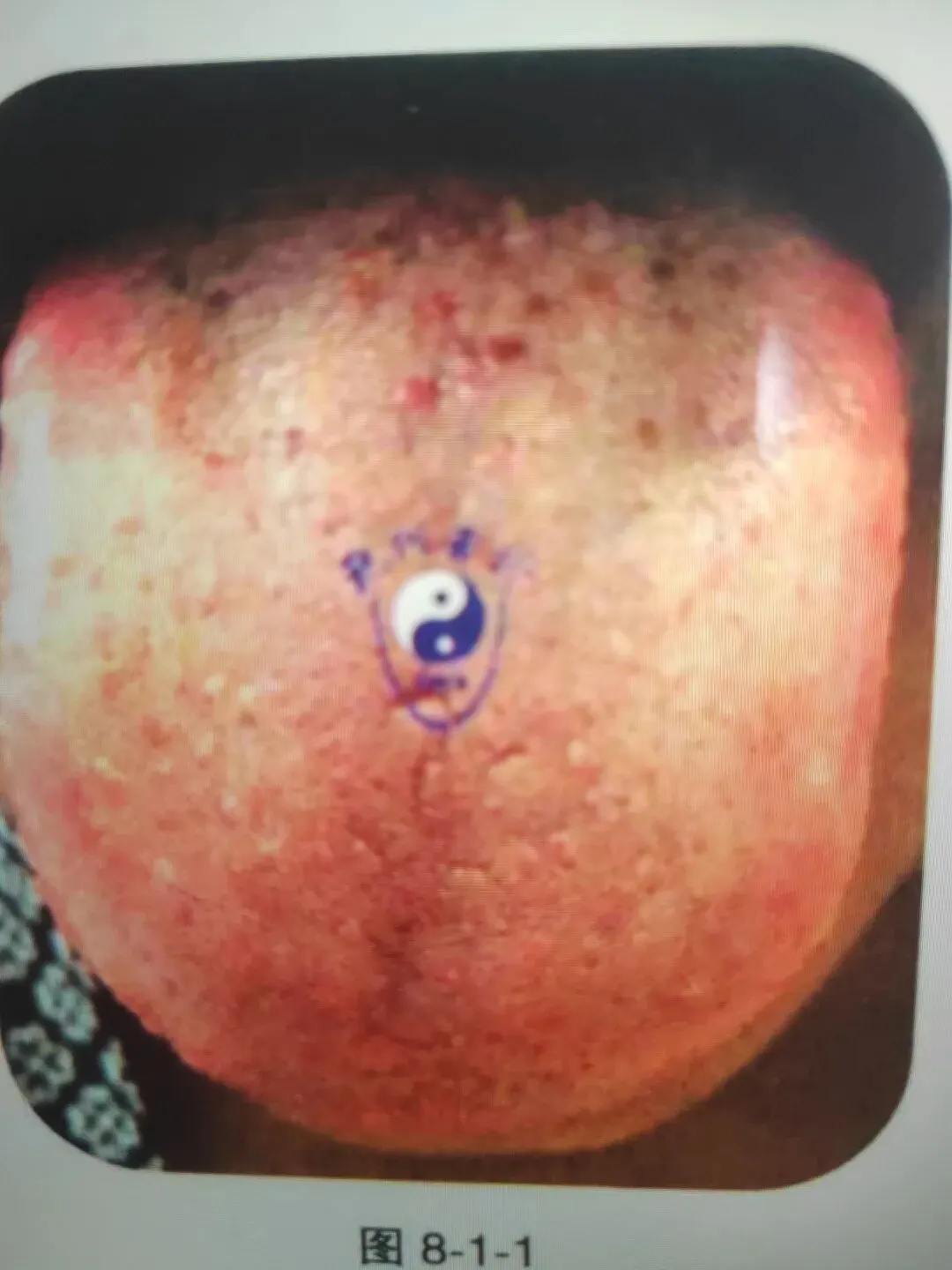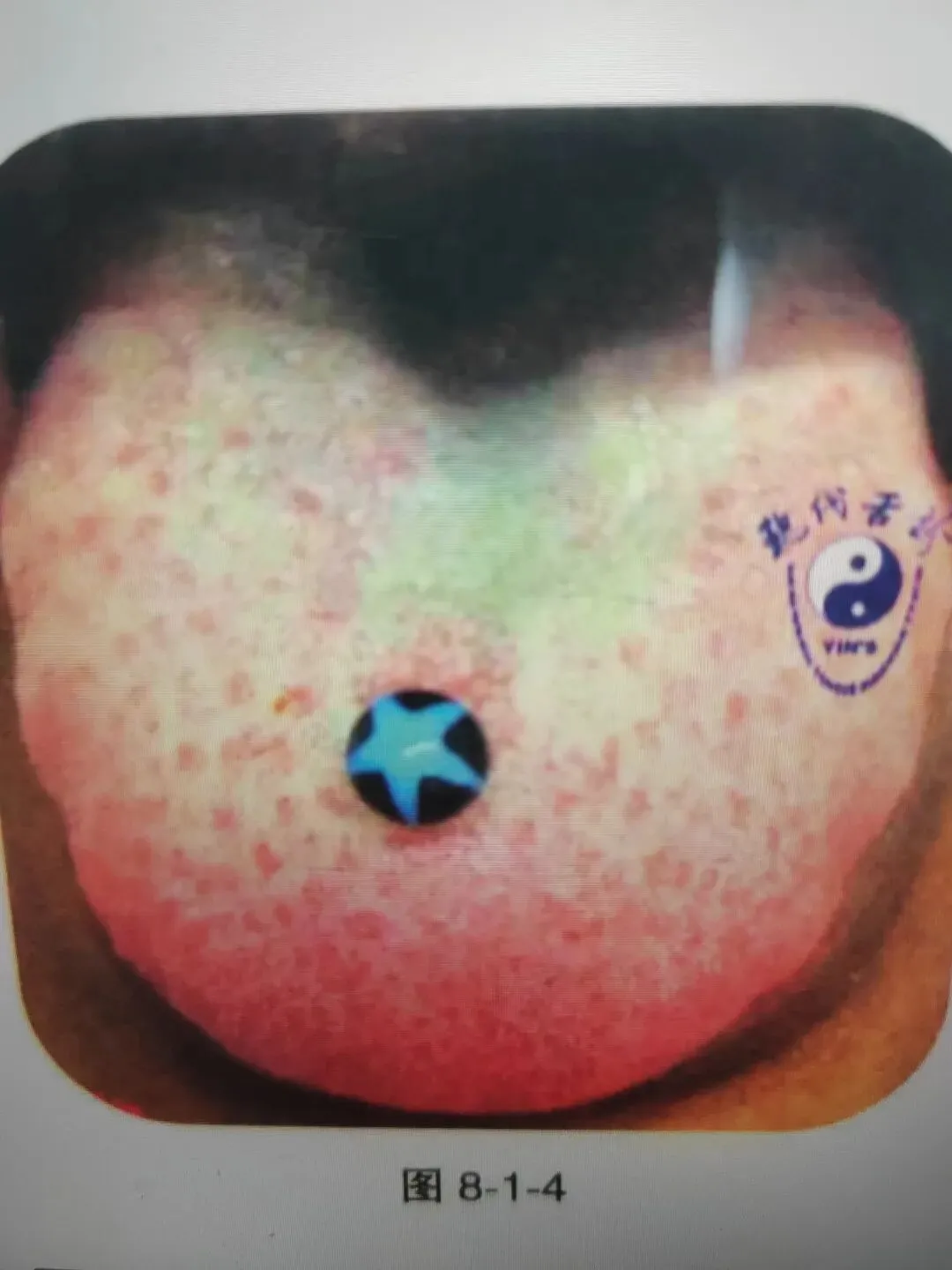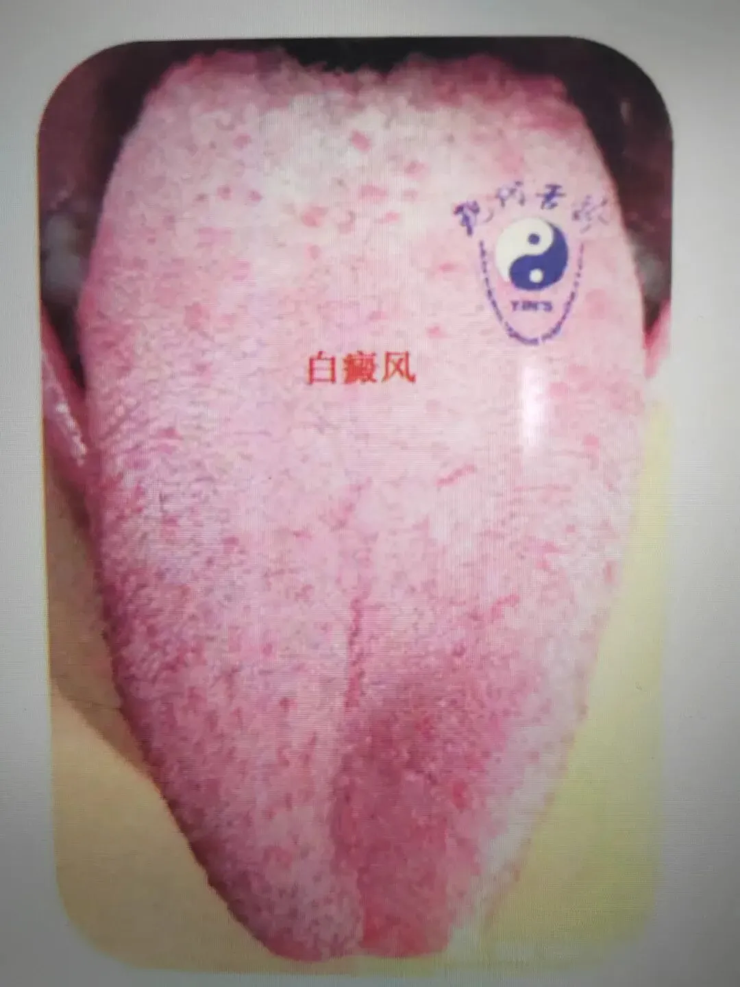 本图为白癜风患者的舌象,该类舌象特点表现为舌尖较平,舌面上可见或多或少的红色或白色小点,也可见于特别白的舌苔