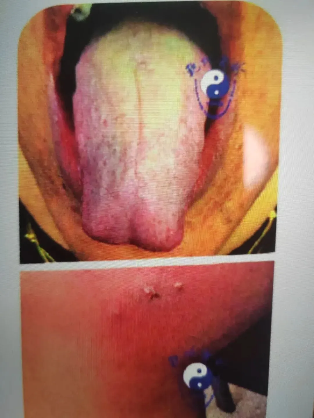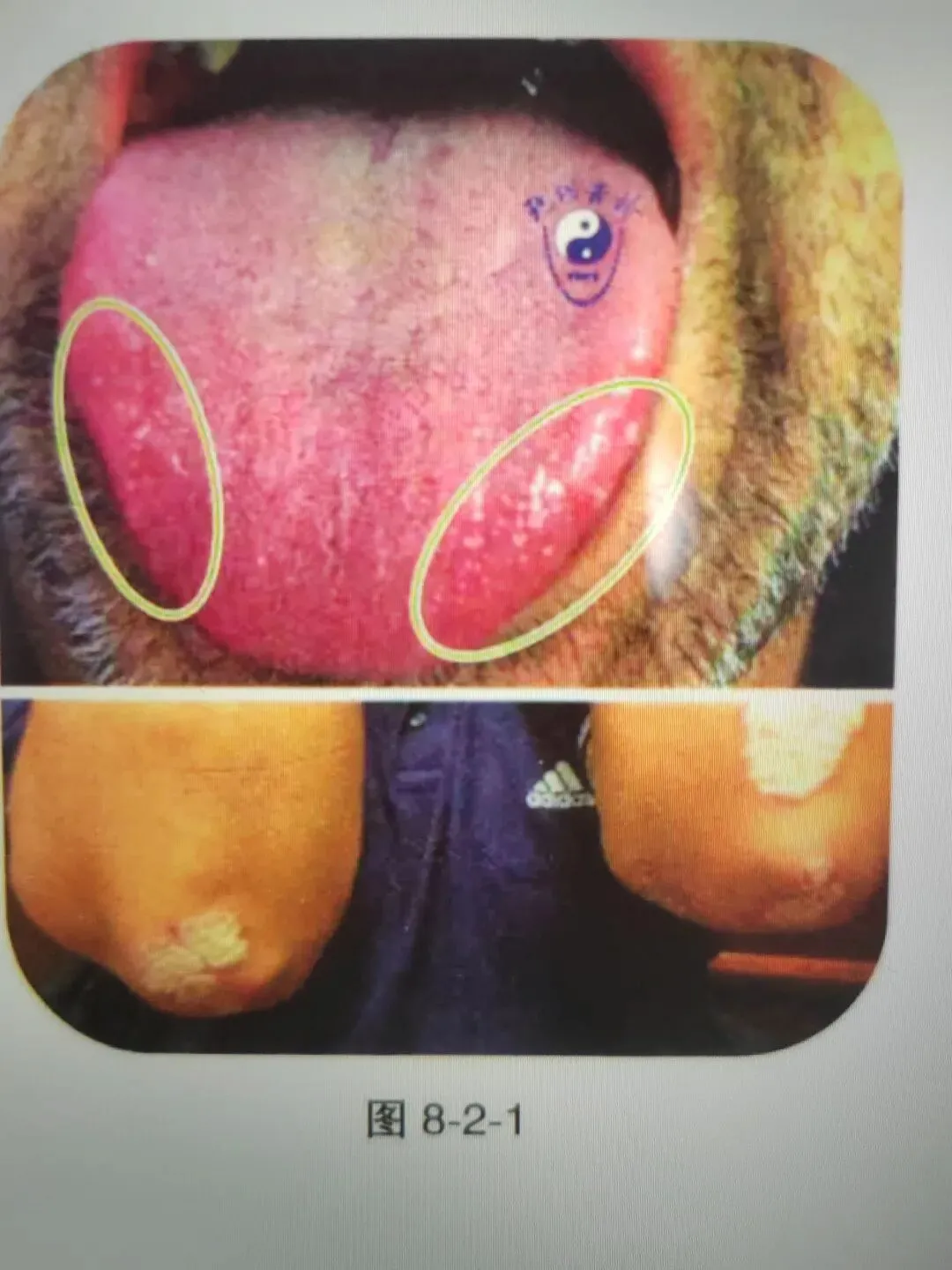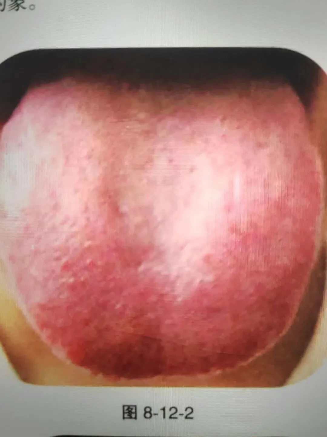 本图为白癜风患者的舌象,该类舌象特点表现为舌尖较平,舌面上可见或多或少的红色或白色小点,也可见于特别白的舌苔