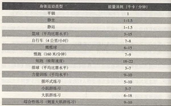 能耗速率和总能耗:体重大比体重小的运动员消耗的能量要多,而且能量摄入量也大。参与运动的肌肉体积和组间间歇时间。大肌肉群的训练或组间短间歇训练会增加能量消耗。另外,训练所造成的能耗总量也会影响到训练后的能耗。一般来说,影响能耗的主要因素有:基础代谢率(BMR)、食物热效应(TEF)、身体活动热效应(TEA,即运动能耗)以及适应性生热(AT)。运动员的安静代谢率要比不常运动的人所占的每日能耗比值低(会低20%~45%),有些因素可以改变安静代谢率,包括年 龄、性别、体重、瘦体重、运动水平以及遗传TEM在餐后可以持续几个小时,并与进食的食物结构有关。TEM中碳水化合物大约占5%~10%,脂肪大约占3%~5%,蛋白质大约占 20%~30%(Flatt1992)。适应性生热(AT)通过多途径、多因素对三个主要热效应产生影响,包括生长、怀孕、环境温度、海拔、用药、毒品(例如酒精、甲基化黄嘌呤衍生物、烟)以及身体和心理压力。