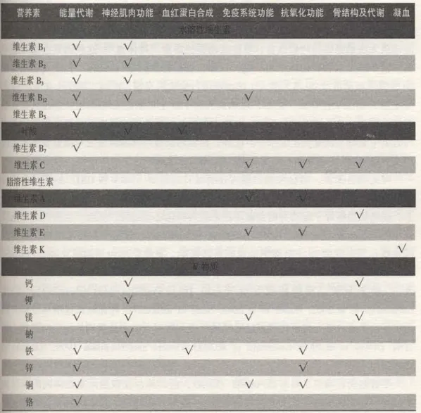 微量元素:摄入不足会对运动成绩产生负面影响(Fogelholm 2000)。人体在压力条件下,如环境变化、参加体育活动都会引起体内微量元素水平的下降,人体对维生素和矿物质,尤其是水溶性维生素以及维生素A、E的需要量会增加,补充复合维生素可以提高运动员做功能力和“一般健康”水平。人体缺乏维生素B1、核黄素、维生素B。会影响微量元素整体水平、红细胞和转酮醇酶激活系数(E-TKAC)及有氧功率。有些运动项目的女运动员,体内的钾、镁浓度低于正常值。
