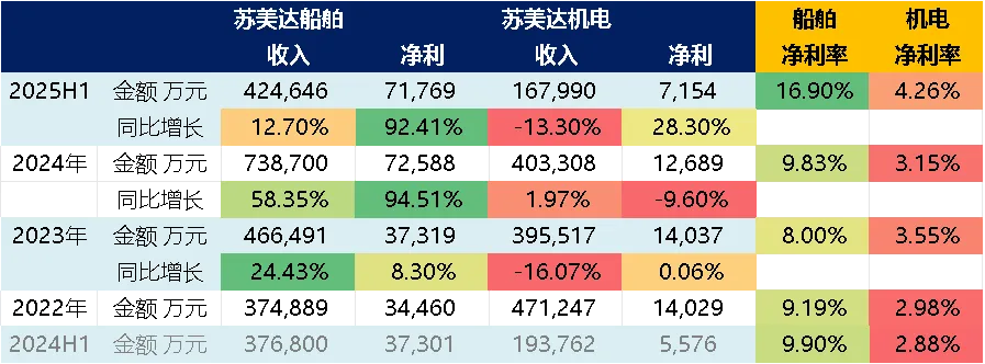 先来看苏美达船舶,2022年收入37.49亿,净利润3.47亿,净利率9.19%;2023年收入46.65亿增长24.43%,净利润3.73亿增长8.30%,比收入增速慢;2024年收入73.87亿增长58.35%,净利润7.26亿增长94.51%;2025年上半年42.46亿增长12.70%,净利润7.18亿增长92.41%。