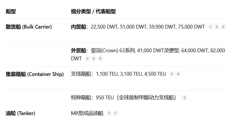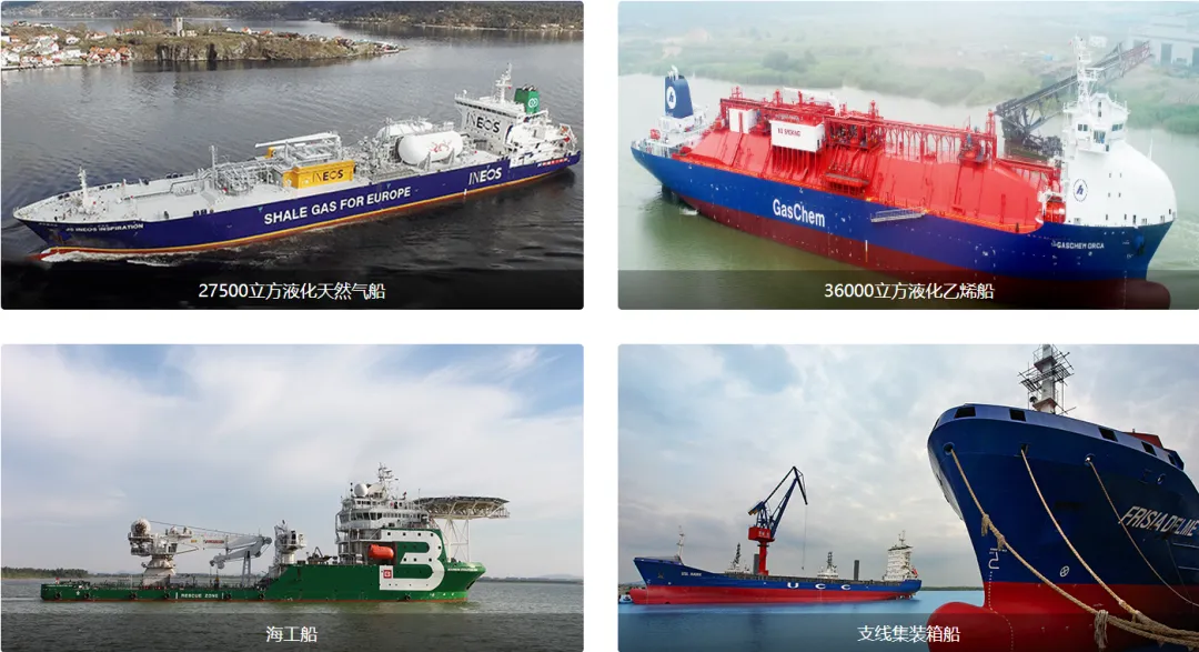 - 船型:VLCC、LNG、集装箱、军船、海工